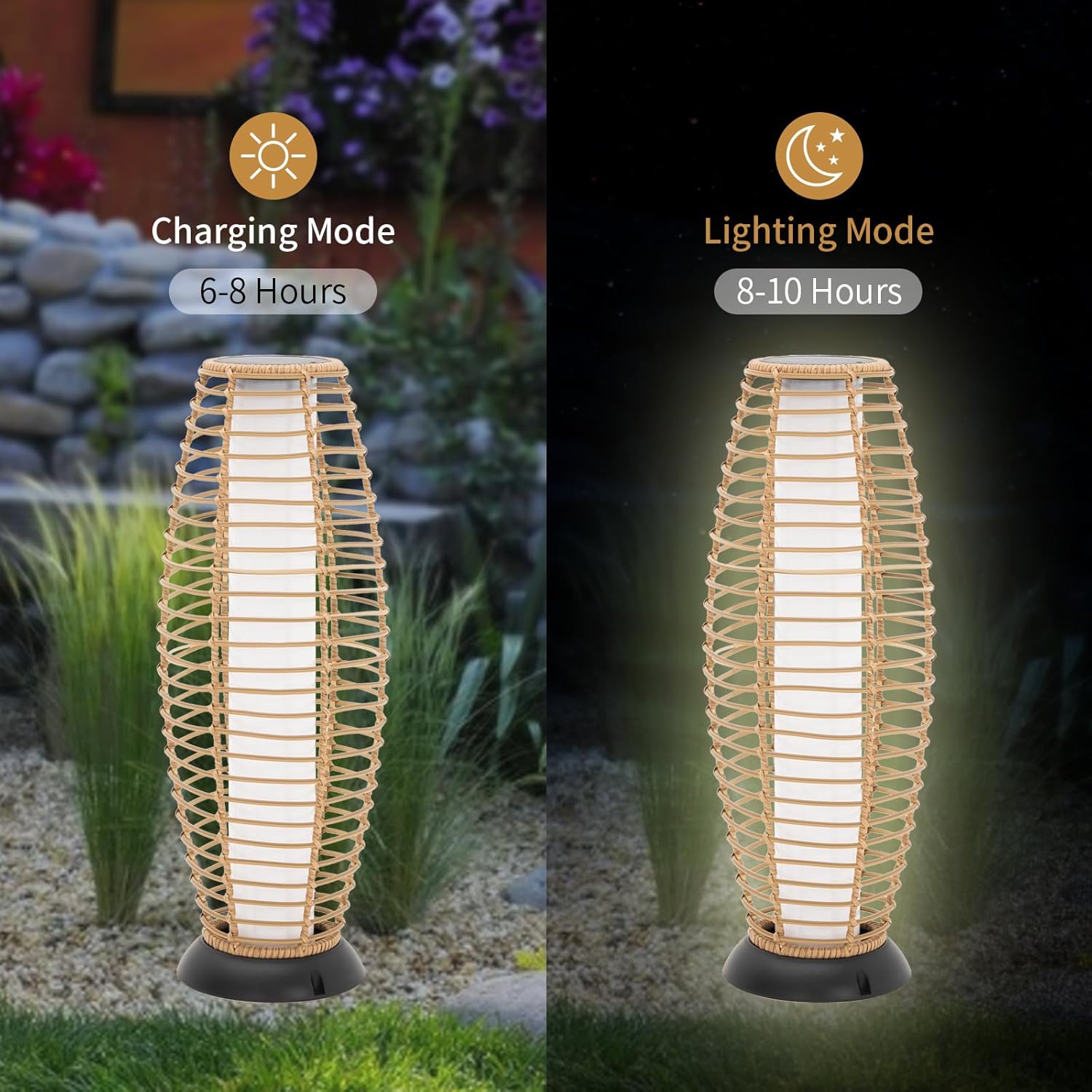 - HIGH EFFICIENCY&ECO-FRIENDLY: As it utilizes the solar power to generate energy and glow, this solar lamp is eco-friendly that it reduces environmental pollution. You no longer need to pay electricity bills. Equipped with a high-efficiency solar panel, this lamp only needs to be fully charged for 6-8 hours at daytime to get 8-10 hours of light at night. Please turn on the lamp before charging, or the solar panel won't start to absorb sun exposure.