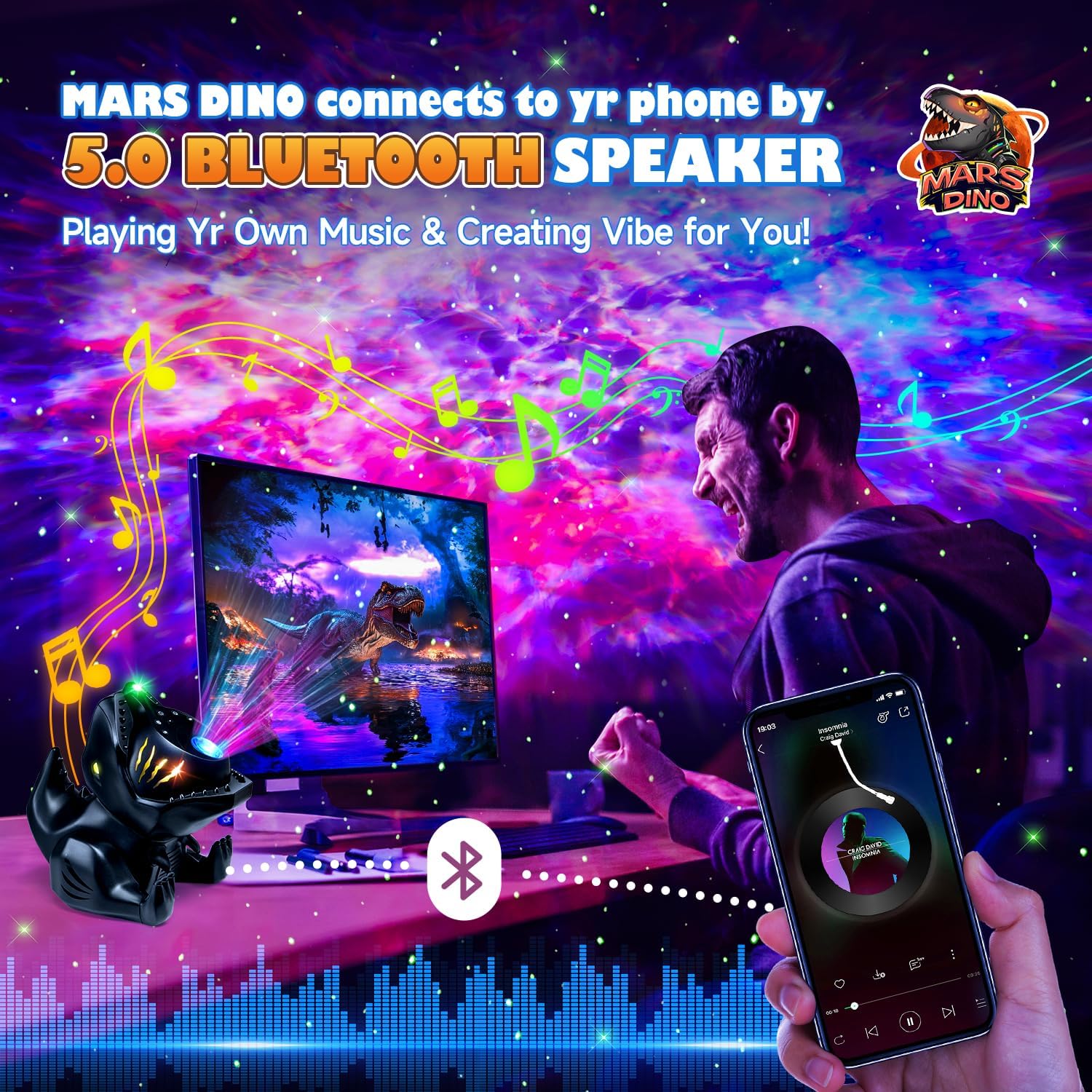 - HiFi BLUETOOTH SPEAKER STAR PROJECTOR: This star projector dinosaur projector light for kids can not only emit brilliant galaxy light, it can sing too! The dinosaur bedroom decor has been updated with 5.3 version HIFI BLUETOOTH SPEAKER. The dinosaur bedroom decor can connect to yr phone & play yr own music. The sound quality is great! the star projector allowing u to relax with soothing music and star lights galaxy light. u'll be amazed to see stars twinkle and nebulae move rhythmically to the beat of the music,creating a more fun and energetic party atmosphere. The dinosaur bedroom decor,ceiling projector lights for bedroom star projector is wonderful mood lighting, dinosaur bedroom decor!