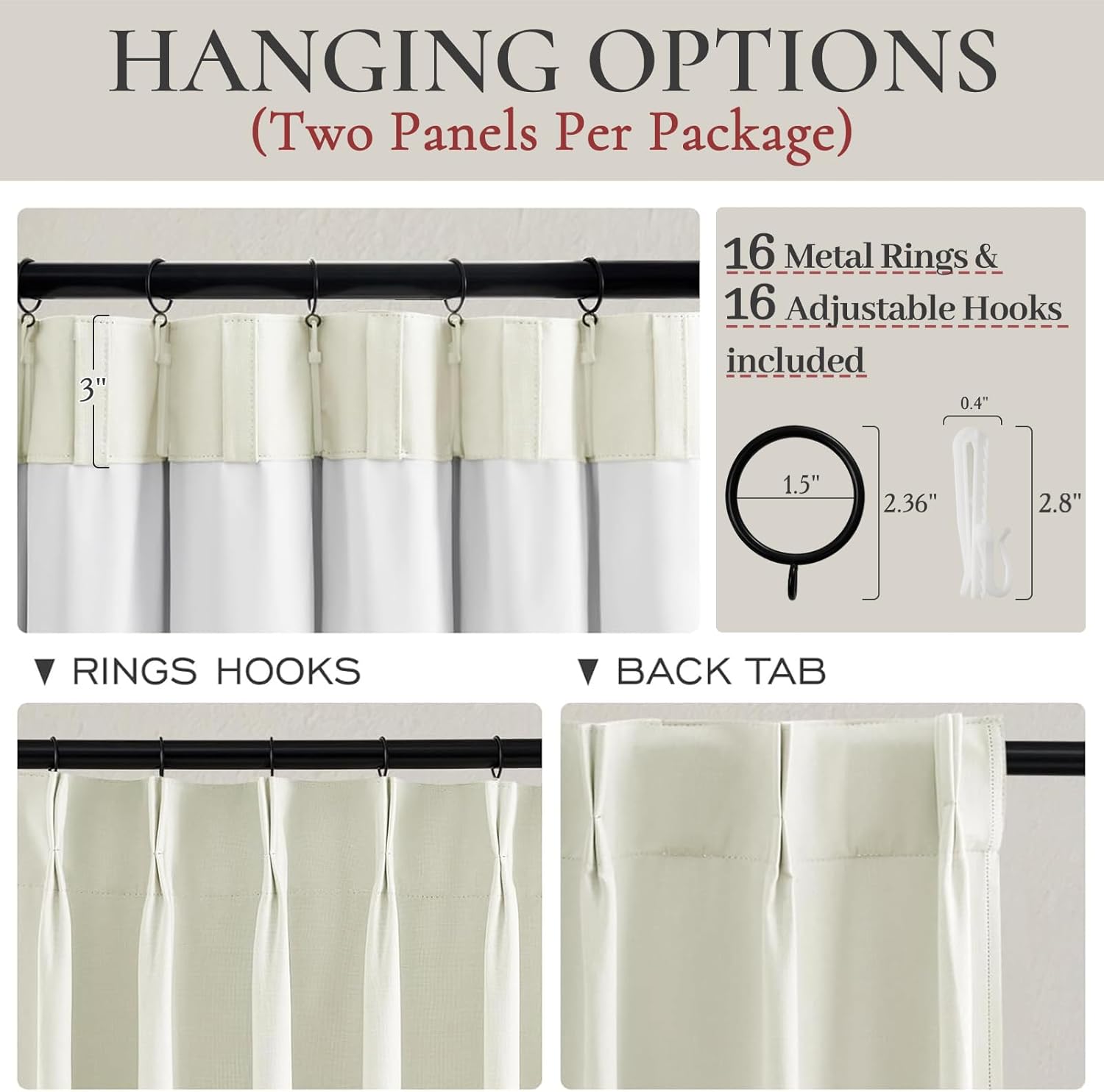 - Ready Made:Set of 2 pinch pleated curtain panels per package with 16 metal rings and 16 adjustable plastic hooks(The adjustable hook can raise and lower the height of the curtain by 1 inch),Each panel measures 40"W x 108"L,pair measures 80"W x 108"L