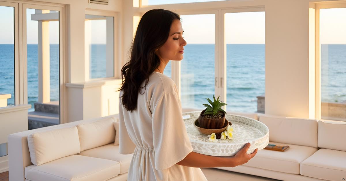 - White STYLISH FLORAL TRAYS with the great workmanship by Vietnamese artisans, flawlessly finished with strong wood core and blue floral pattern well-sorted MOTHER OF PEARL SHELLS inlayed on the surface creates an elegant handmade centerpiece to brighten your decoration, best matches any beach/coastal nauticaNew Home Gifts For Homel theme.