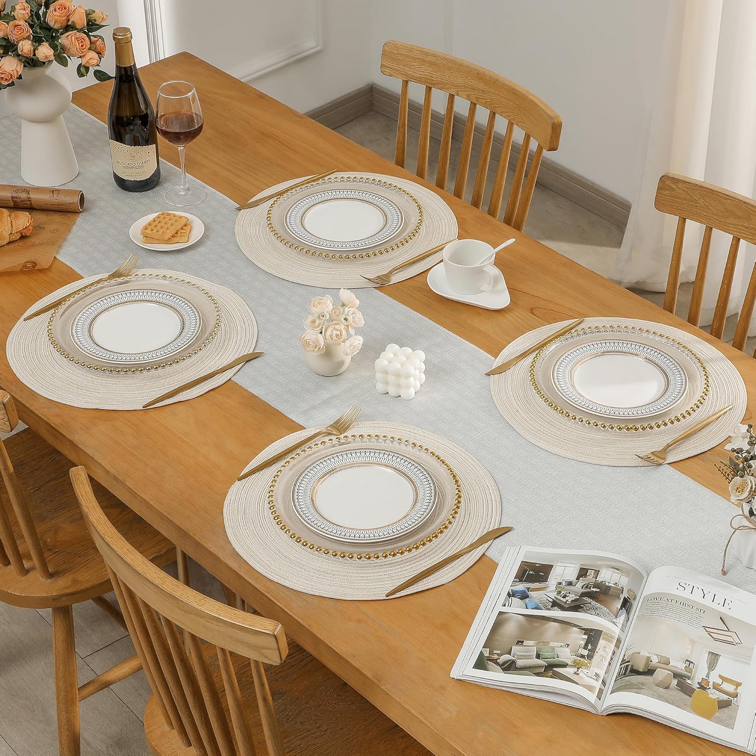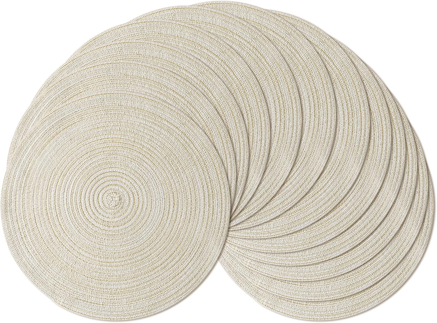 Leetaltree Round Placemats Heat and Slip Resistant Cotton Table Mats, Washable Bohemian Placemats for Dining Tables (White Beige, Set of 12)