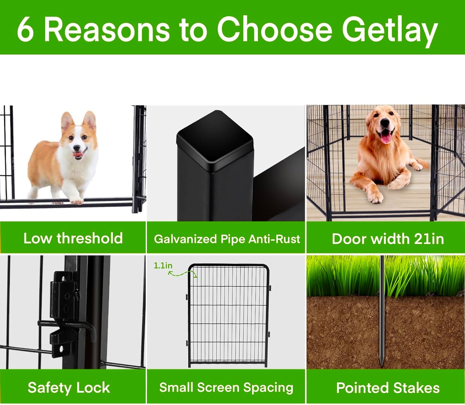 - The Garden Fence for Dogs is Made of Galvanized Pipe Instead of Iron Pipe Because It Has Better Rust Resistance. The Wire Diameter of the Inner Mesh is Thick and the Welding is Firm. The Spacing of the Wire Mesh is Small, Only 1.1 Inches. So You Don't Need to Worry That it Will Get Stuck on Your Puppy's Neck, and Outside Critters Can't Pass Through it and Damage Your Garden