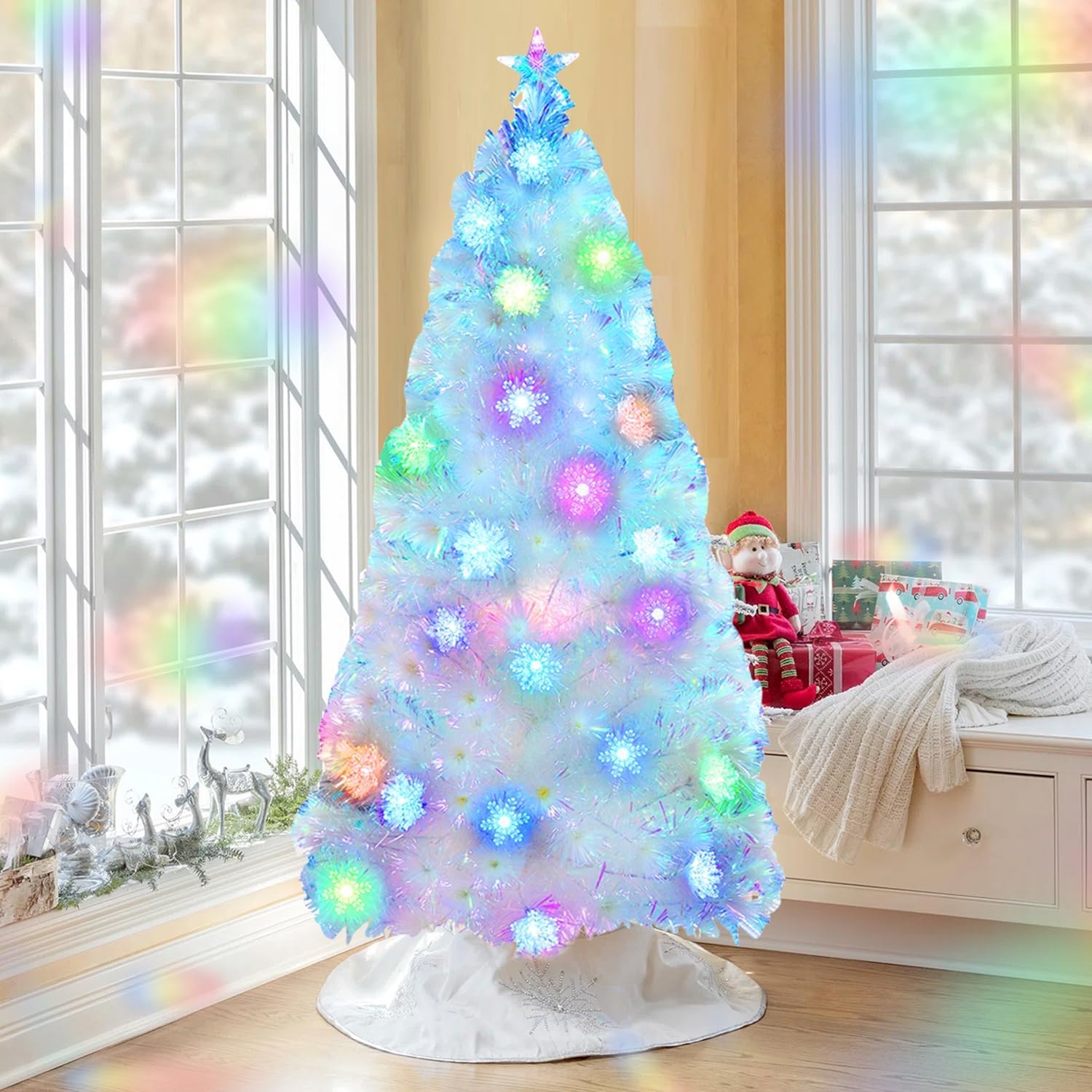 Juegoal 5ft Pre-Lit Artificial Christmas Tree, Lighted Optical Fiber Xmas Trees with Color Changing LED Lights, Snowflakes & Top Star, Party Home Holiday Fake Multicolored Tree with Metal Legs, White