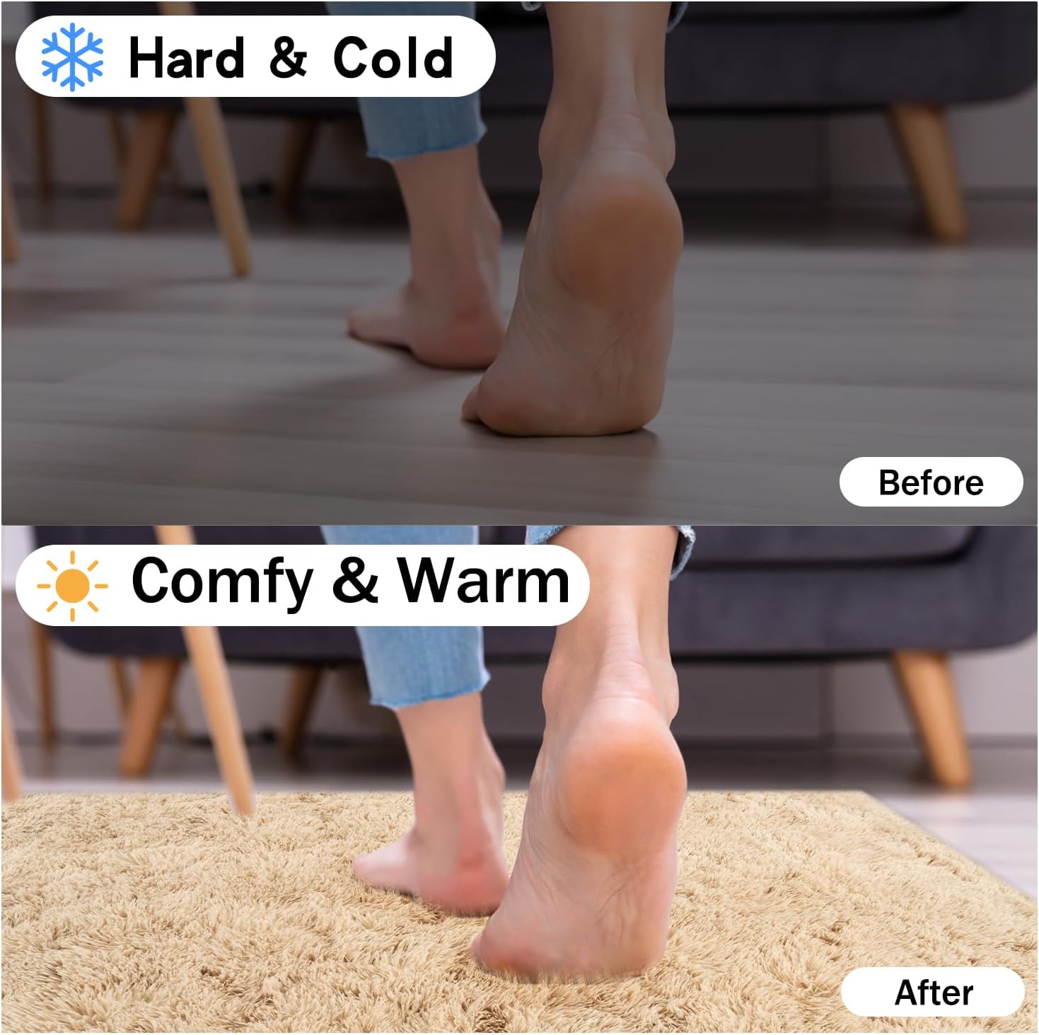 - Rezutan Area Rugs-Soft Fluffy Rug:The Rezutan shag area rug is crafted from durable microfiber, ensuring a plush and incredibly comfortable experience. Its 1.7-inch high pile surface is dense and velvety to the touch, while the 0.3-inch memory foam provides superior cushioning, isolating you from the cold ground and offering soundproofing benefits. Because of the plush fur on the Soft Fluffy rug, you’ll feel like walking on the clouds when walking barefoot on the large bedroom rugs.