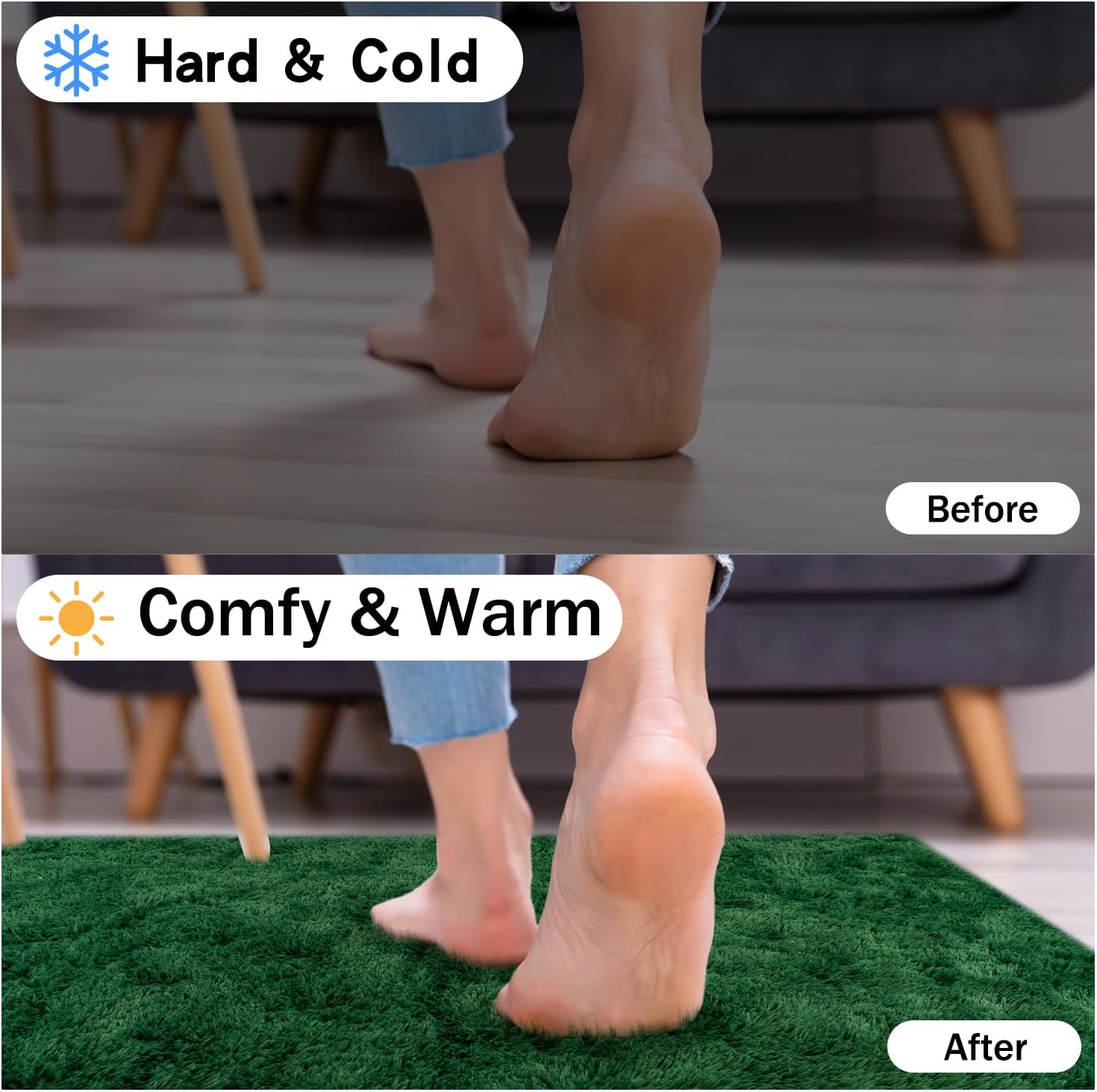 - Rezutan Area Rugs-Soft Fluffy Rug:The Rezutan shag area rug is crafted from durable microfiber, ensuring a plush and incredibly comfortable experience. Its 1.7-inch high pile surface is dense and velvety to the touch, while the 0.3-inch memory foam provides superior cushioning, isolating you from the cold ground and offering soundproofing benefits. Because of the plush fur on the Soft Fluffy rug, you’ll feel like walking on the clouds when walking barefoot on the large bedroom rugs.