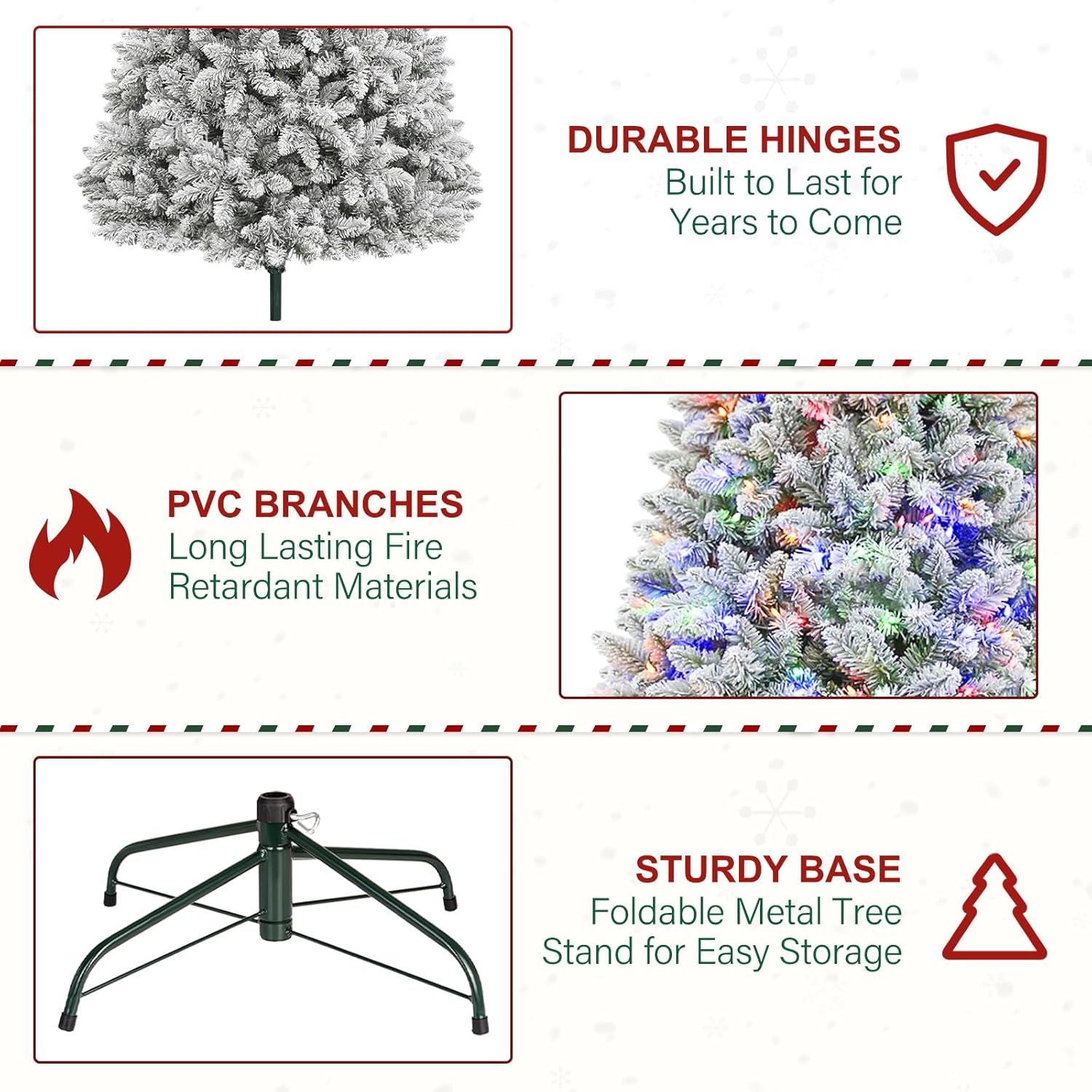 • 🎄WARRANTY: Our Pre-Lit snow flocked Christmas tree comes with a 1-year warranty, demonstrating our commitment to quality and customer satisfaction.