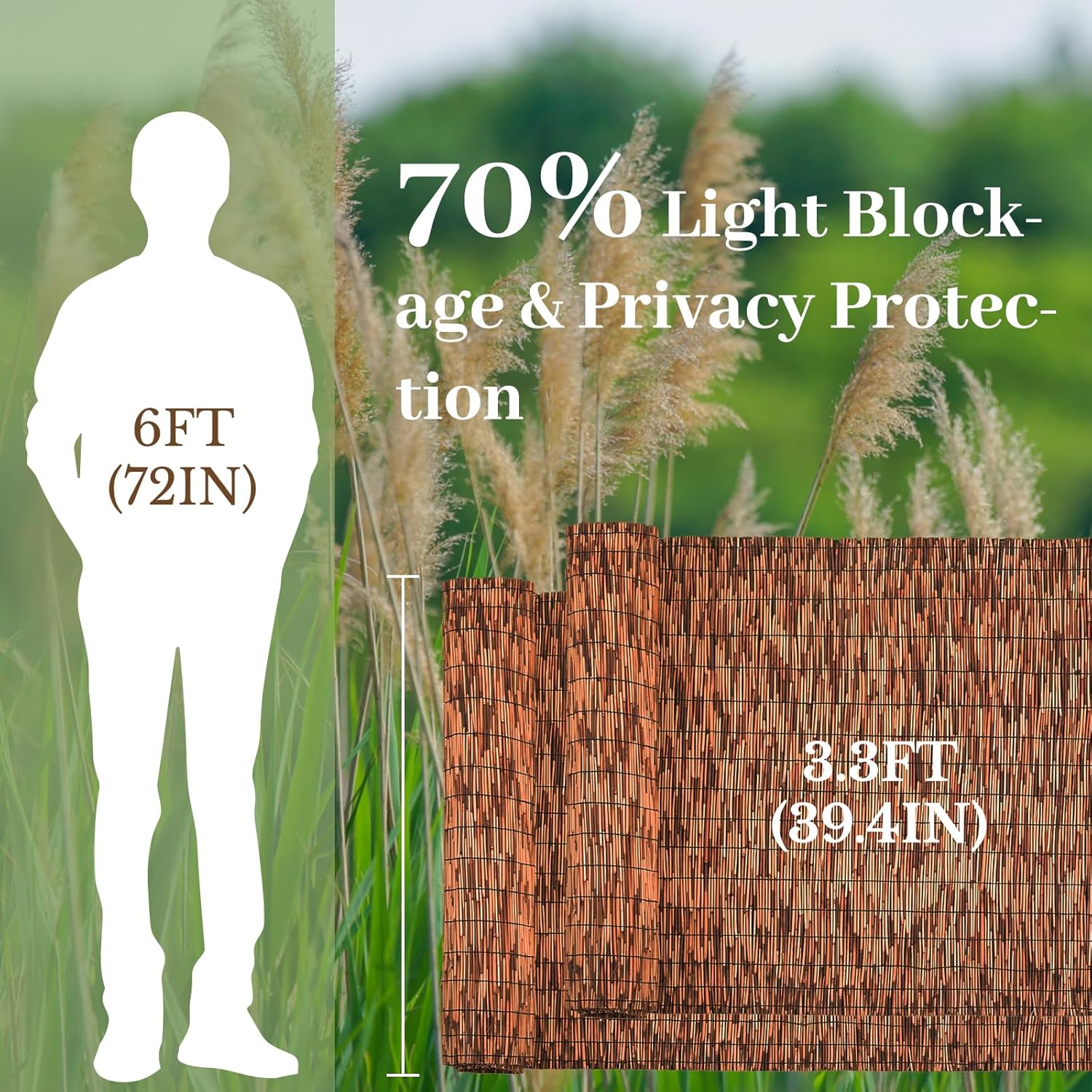- Product Features: The bamboo reed fence rolls are 2 Pack 3.3 feet high and unfold to a length of 16.4 feet. They are designed to conceal unsightly bins, fences, or other objects, while also enhancing privacy for backyards, balconies, patios, or swimming pools