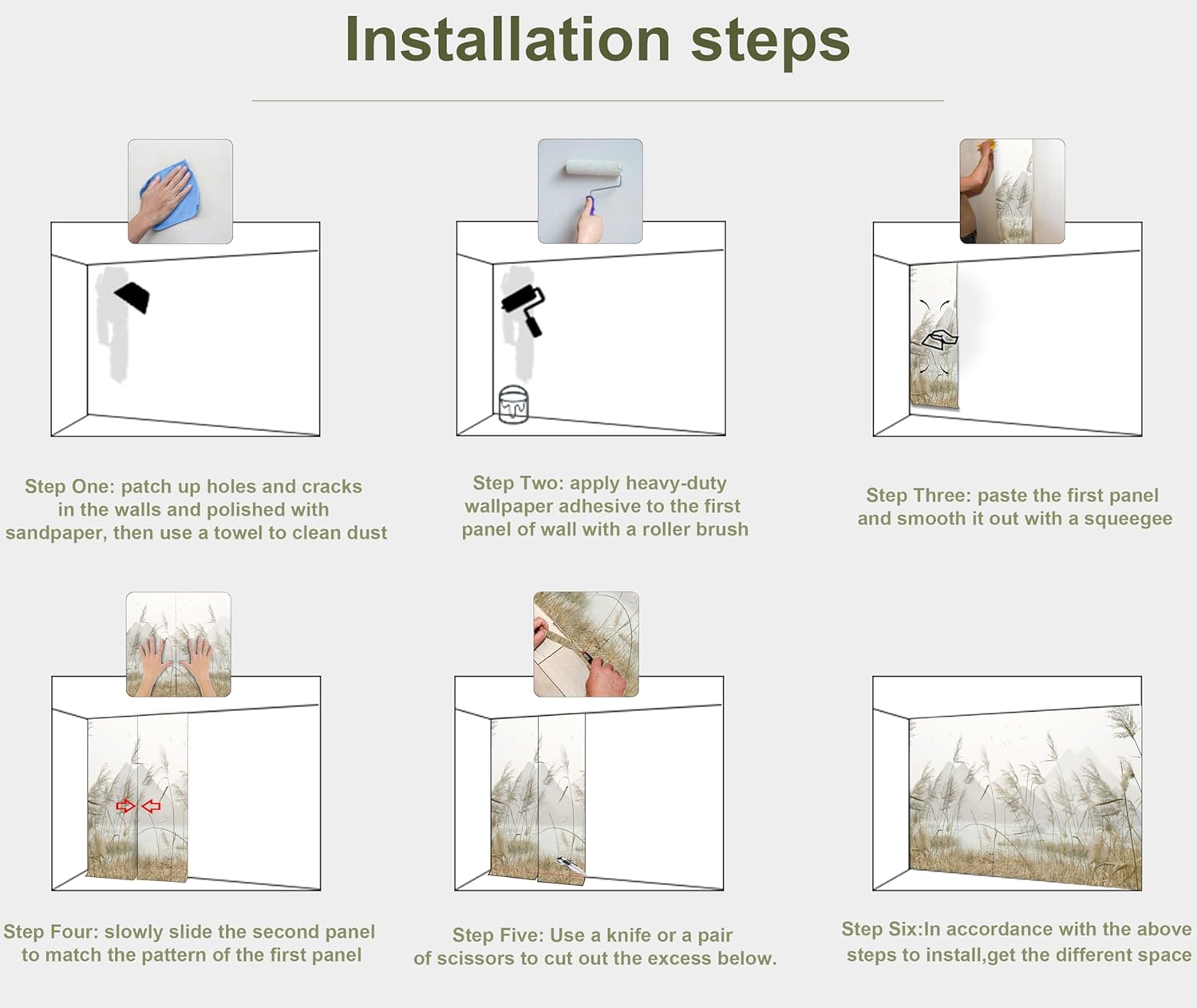 - INSTALLATION - 1.Fill in all cracks or holes and clean dust dirt and grease on the wall surface. 2. Apply the heavy duty wallpaper paste on the wall not mural. 3. Use a spirit level to mark first strip location. 4. match the pattern by sliding into place. 5.use a scraper to smooth out bubbles press. 6. Let dry for a few minutes and that's it! Please Note: Not self-adhesive. We recommend to use a standardized fleece wallpaper paste.