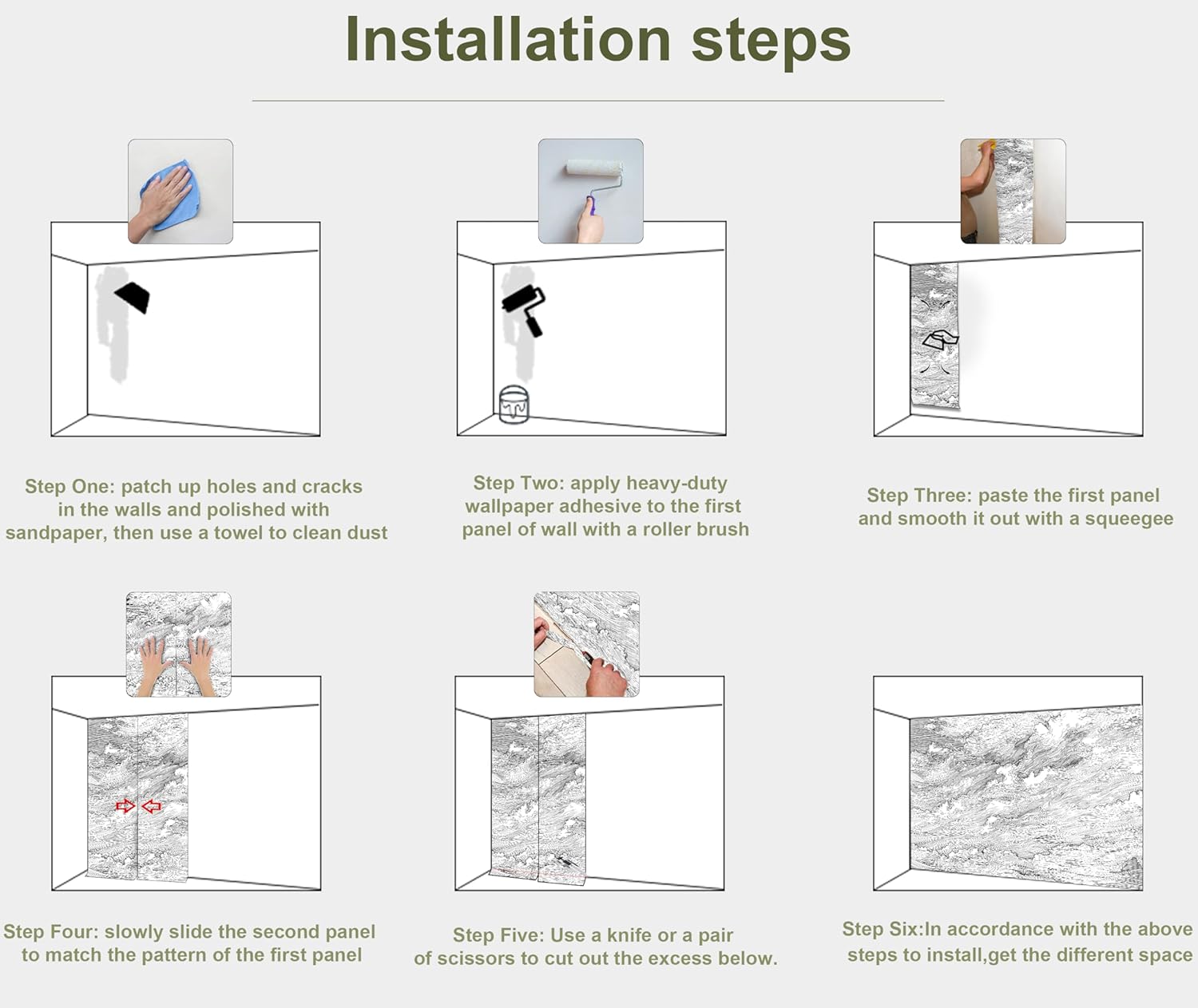 - INSTALLATION - 1.Fill in all cracks or holes and clean dust dirt and grease on the wall surface. 2. Apply the heavy duty wallpaper paste on the wall not mural. 3. Use a spirit level to mark first strip location. 4. match the pattern by sliding into place. 5.use a scraper to smooth out bubbles press. 6. Let dry for a few minutes and that's it! Please Note: Not self-adhesive. We recommend to use a standardized fleece wallpaper paste.