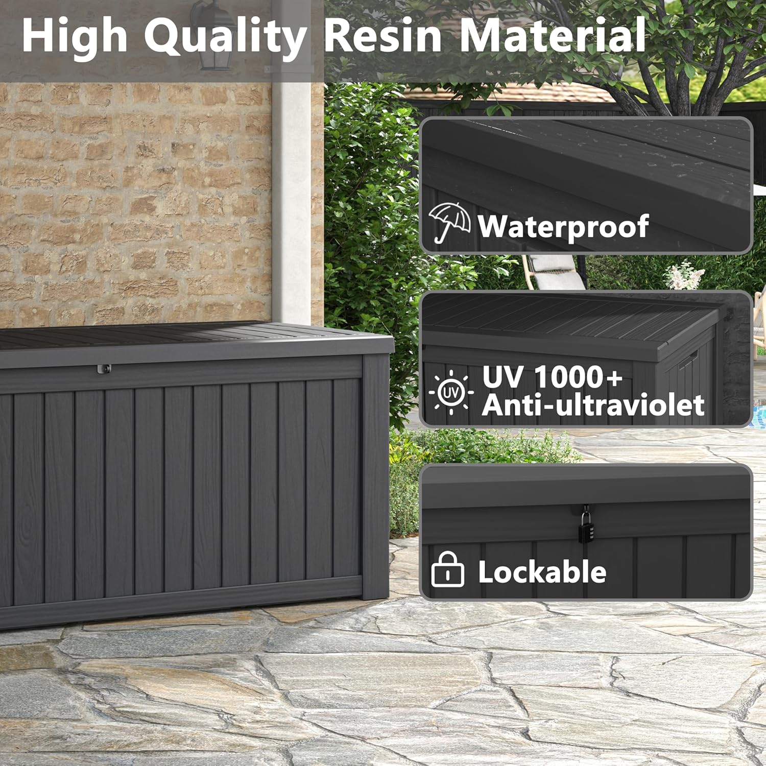 - ALL WEATHER RESISTANT - Weatherproof resin makes this outdoor storage box waterproof, rustproof, corrosion resistant and extremely low maintenance; its wood grain complements any dΓ©cor; NOTE: The colour of the storage box may vary in different scenarios, with darker colours indoors and lighter colours outdoors; to avoid accidents, please remember to remove all stored items before moving the storage box!