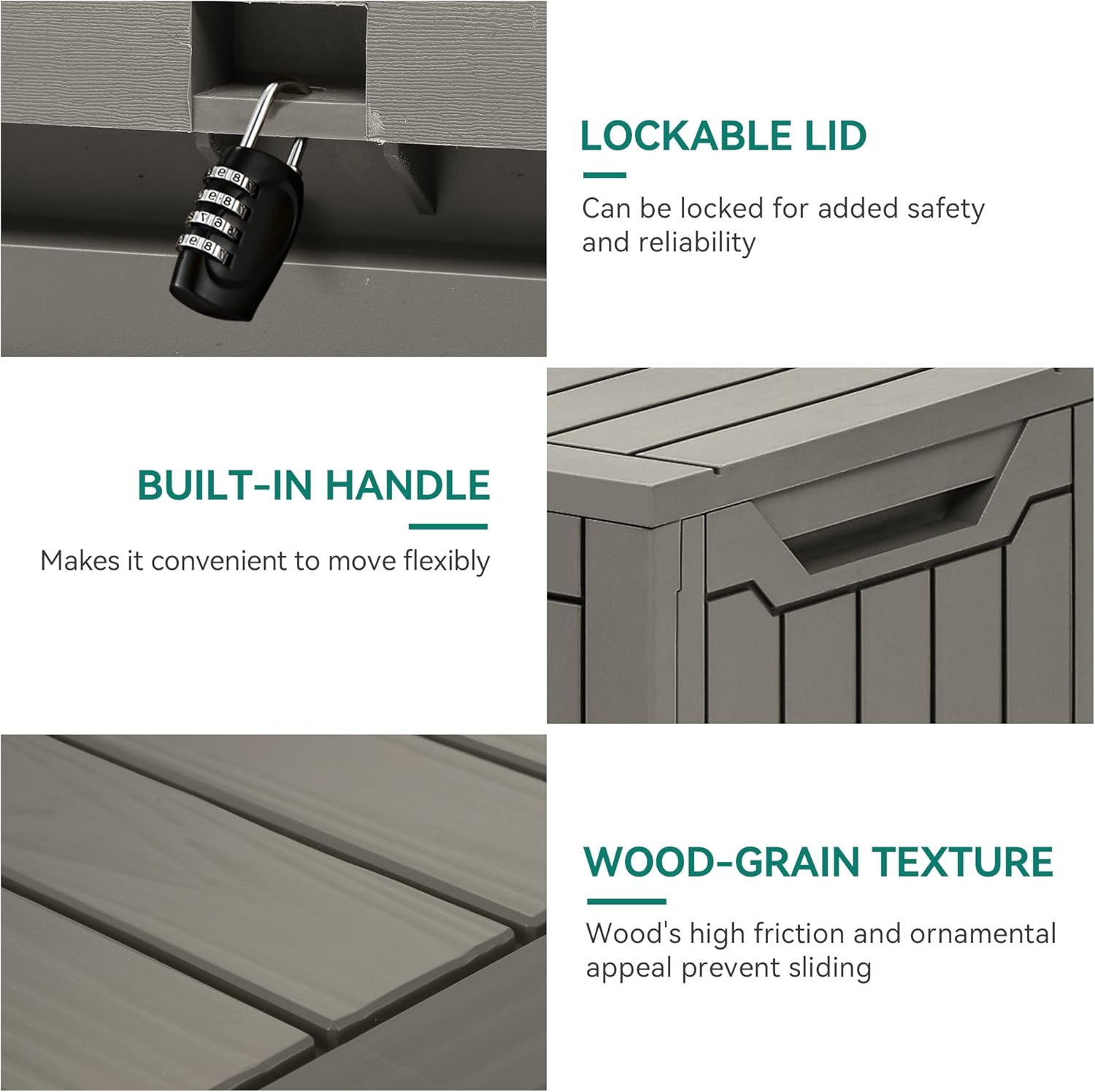 - Solid Build: Made from robust, weather-resistant resin, this outdoor storage box is designed to withstand water, rust, UV, fading, and various elements for long-lasting use