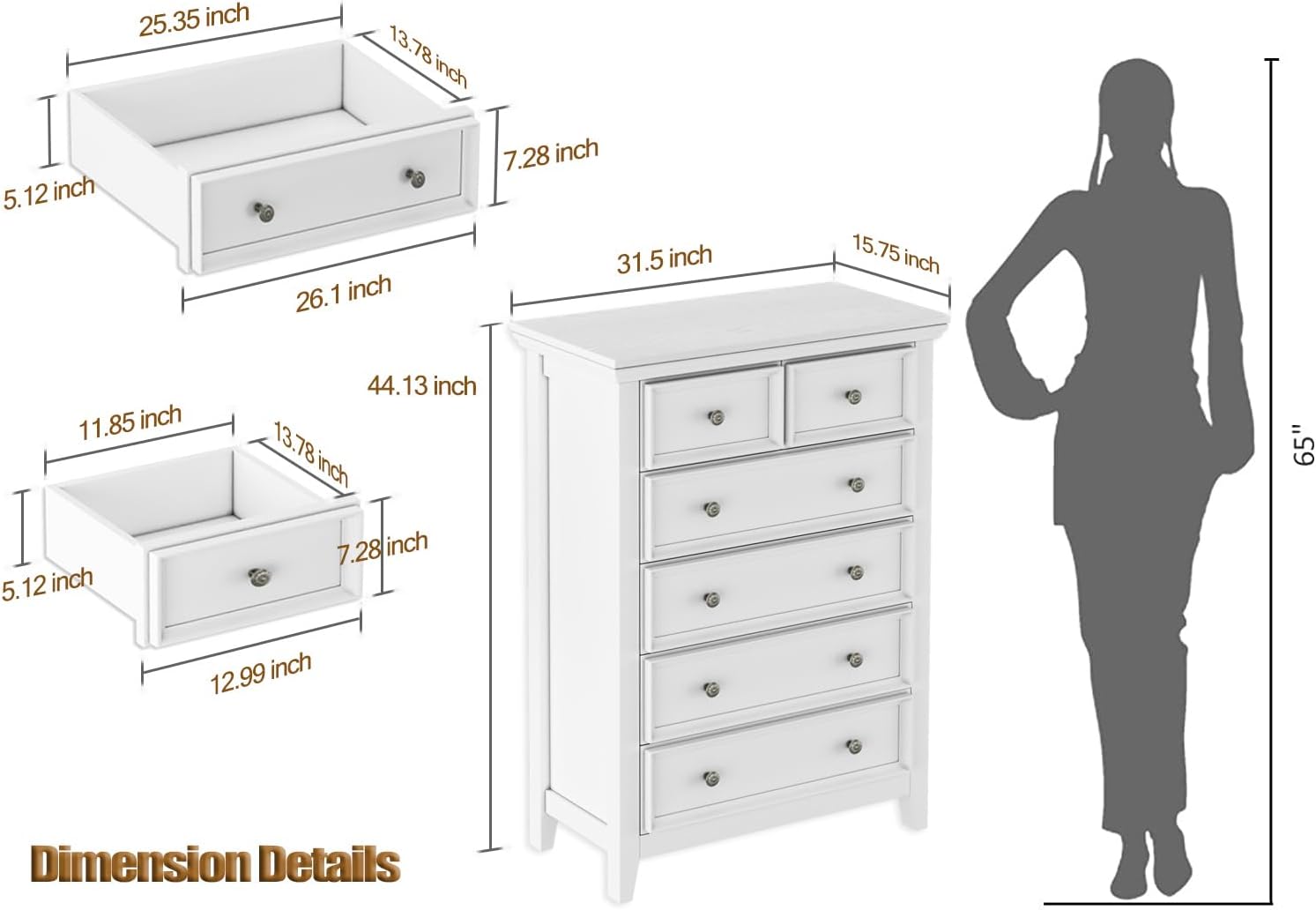 - ăAmple Storage SpaceăThe dimension of the assembled dresser is 15.75"D x 31.5"W x 44.13"H. The smaller drawer measures 13.78"D x 11.85"W x 5.12"H and the bigger drawer measures 13.78"D x 25.35"W x 5.12"H to store a variety of items
