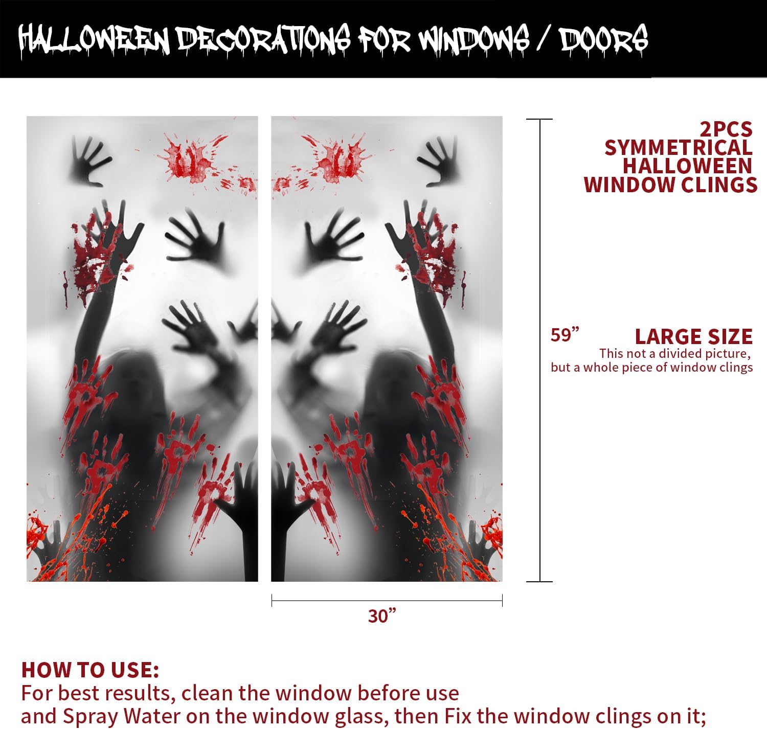Rypyp 2PCS Halloween Decorations Indoor Window Clings, Large Window/Door Covers(59x30in)- Scary Zombie with Bloody Handprints at The Window, Halloween Haunted House Party Décor, Garage Door Cover