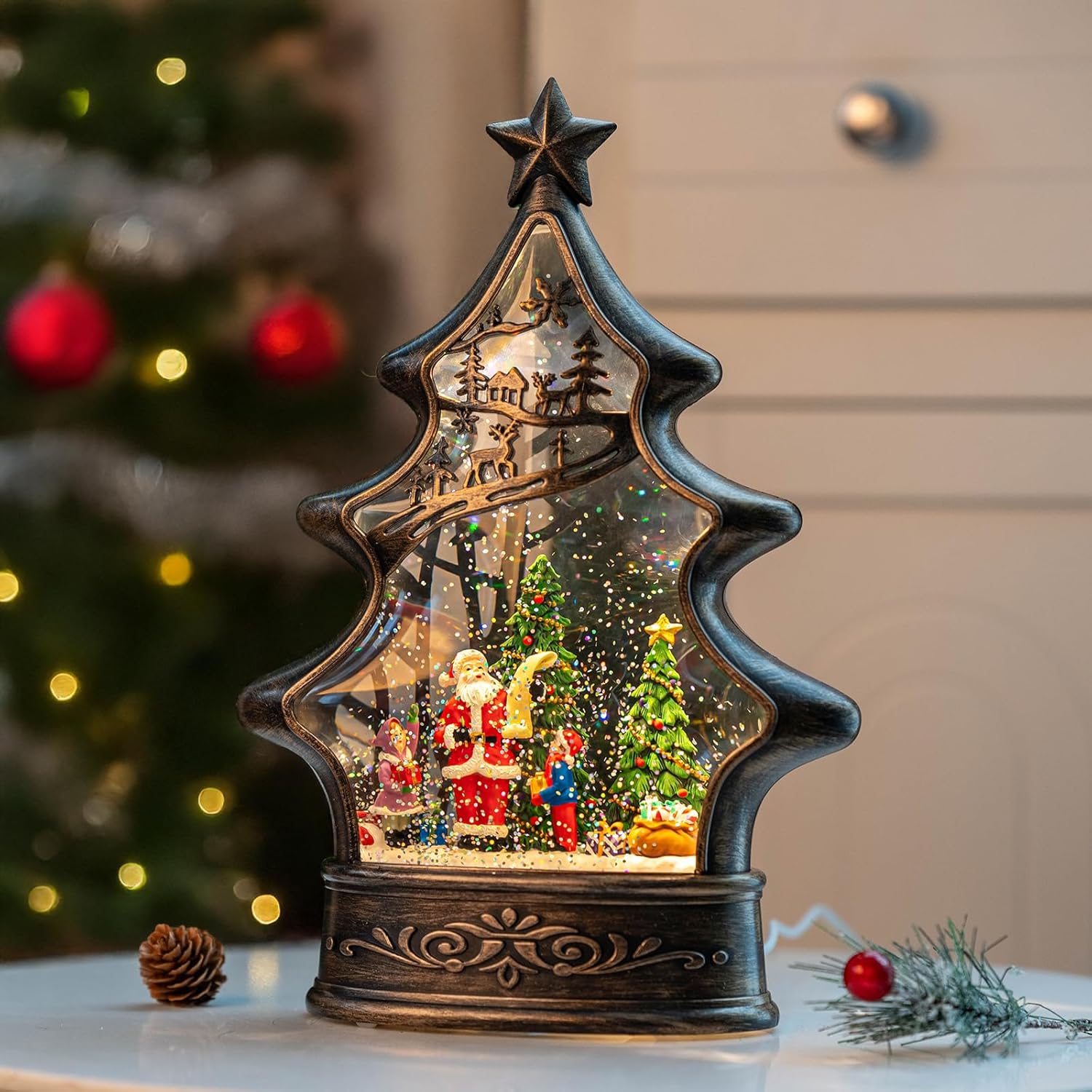 - 🎄【Christmas Snow Globe】Bronze glitter tree lantern with a cut out decorative design on the front and back. Inside, Santa reading his list to the kids as they gather gifts, bringing in Holiday Cheer! When turned on a warm LED shines on the figurine and swirling glitter to gives our Christmas globe a whimsical look for the Christmas Holiday season.