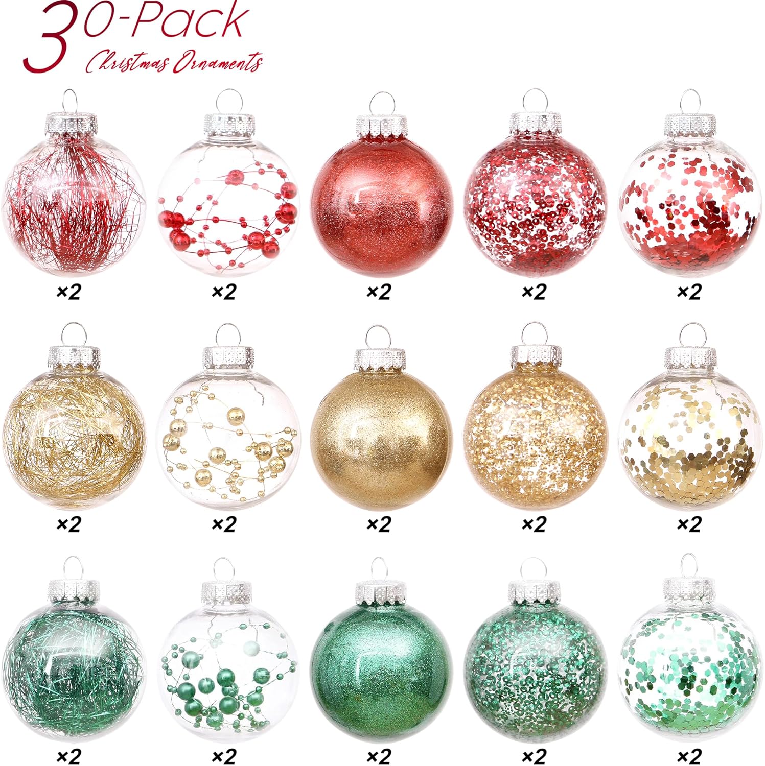Sea Team 60mm/2.36" Shatterproof Clear Plastic Christmas Tree Ball Ornaments Set, Decorative Hanging Transparent Xmas Baubles with Stuffed Delicate Decorations (30 Counts, Gold, Red, Green)