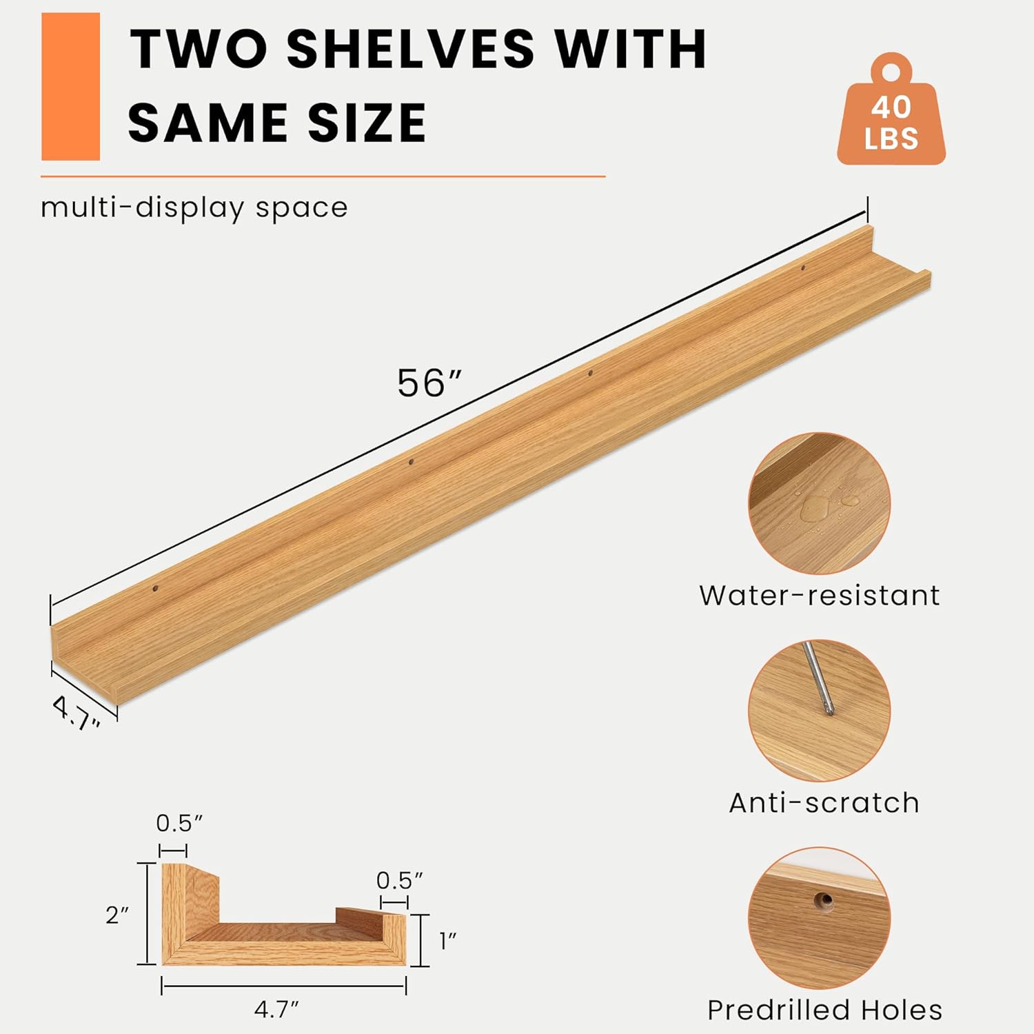 Heimlove Picture Ledge Shelf, Floating Shelves Set of 2, 56 Inches Picture Shelf for Wall with Ledge, Kids Bookshelf Wall Mounted for Living Room Bedroom Decor Books Photo Frames, Natural Oak