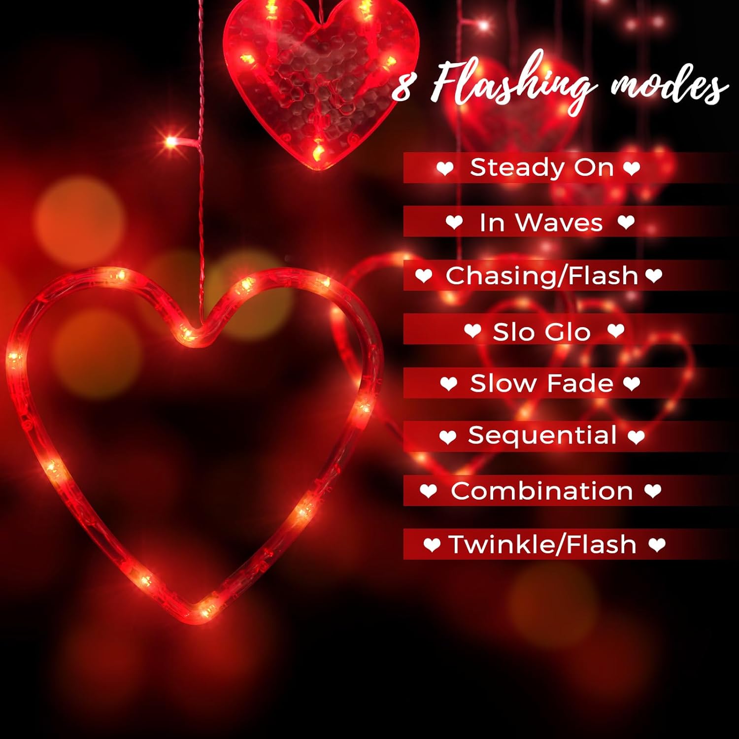 - Valentines Day Window Curtain Lights : Love heart window curtain lights with 138 Led, 12 Love Heart ornaments, 6 big and 6 small heart lights, exudesing a soft and charming light, creating a romantic evening atmosphere for you