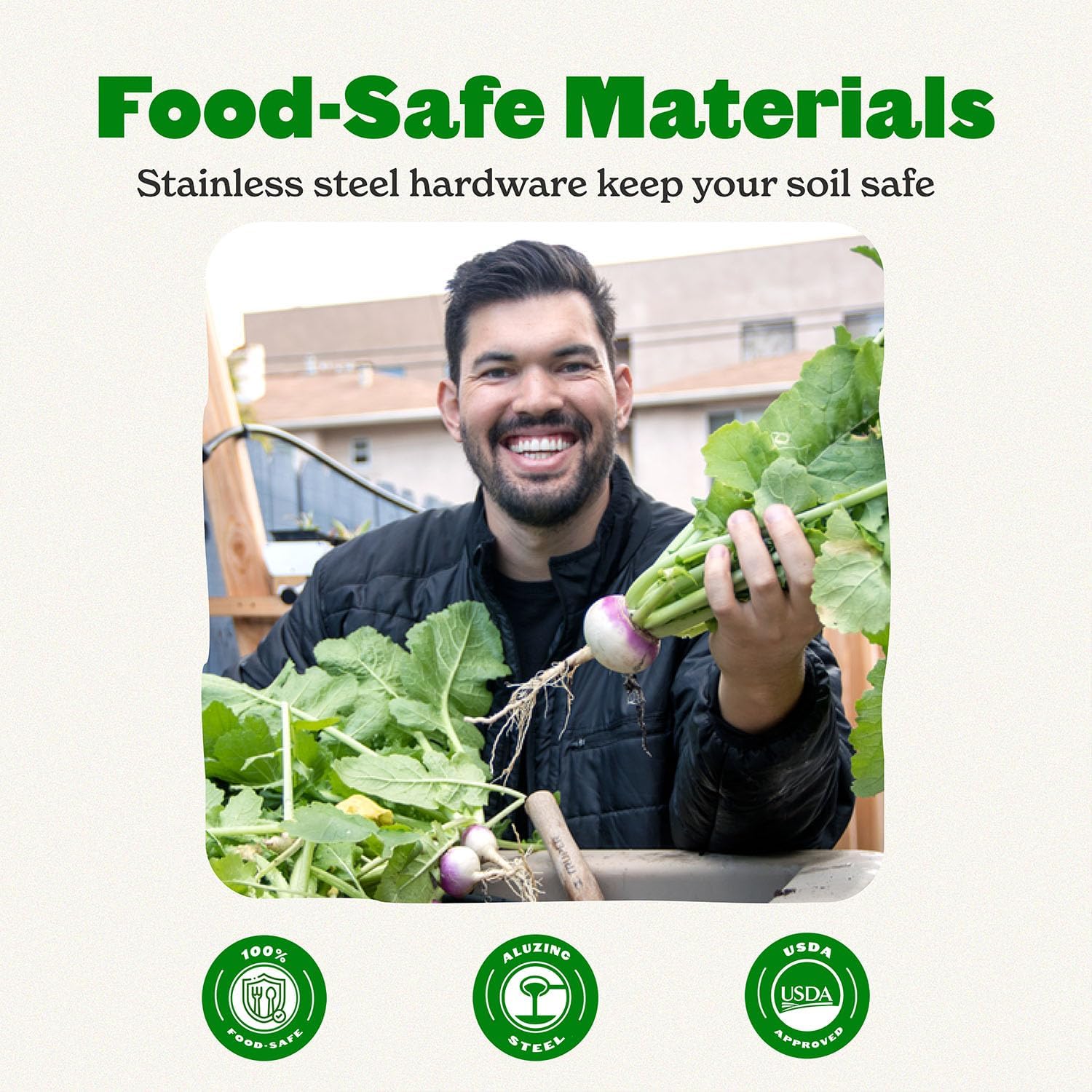 - Food-Safe and Eco-Friendly Materials Crafted with 100% food-safe aluzinc steel and stainless steel hardware, our planters keep your soil chemical-free for worry-free growing. Made using sustainable practices and recycled materials, our raised beds are perfect for eco-conscious gardeners.