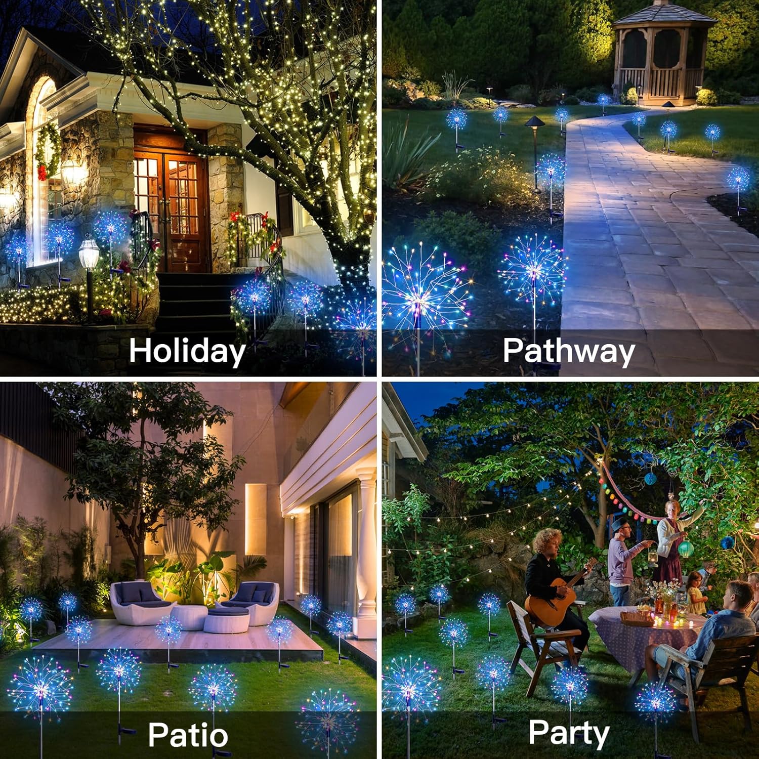 - 2Pack Solar Garden Lights: Ignite your outdoor scenes with our 150LED solar stake lights–2pack for double the magic! Upgraded sleek rounds burst with 8 light modes, painting yard, garden, or patio with a beautiful, radiant glow. See these solar firefly lights dance like a sea of radiant dandelions, casting a beautiful, dazzling light that brings your outdoor spaces to life. Multiply the enchantment with multiple sets, creating a breathtaking display that elevates your decor game to new heights.