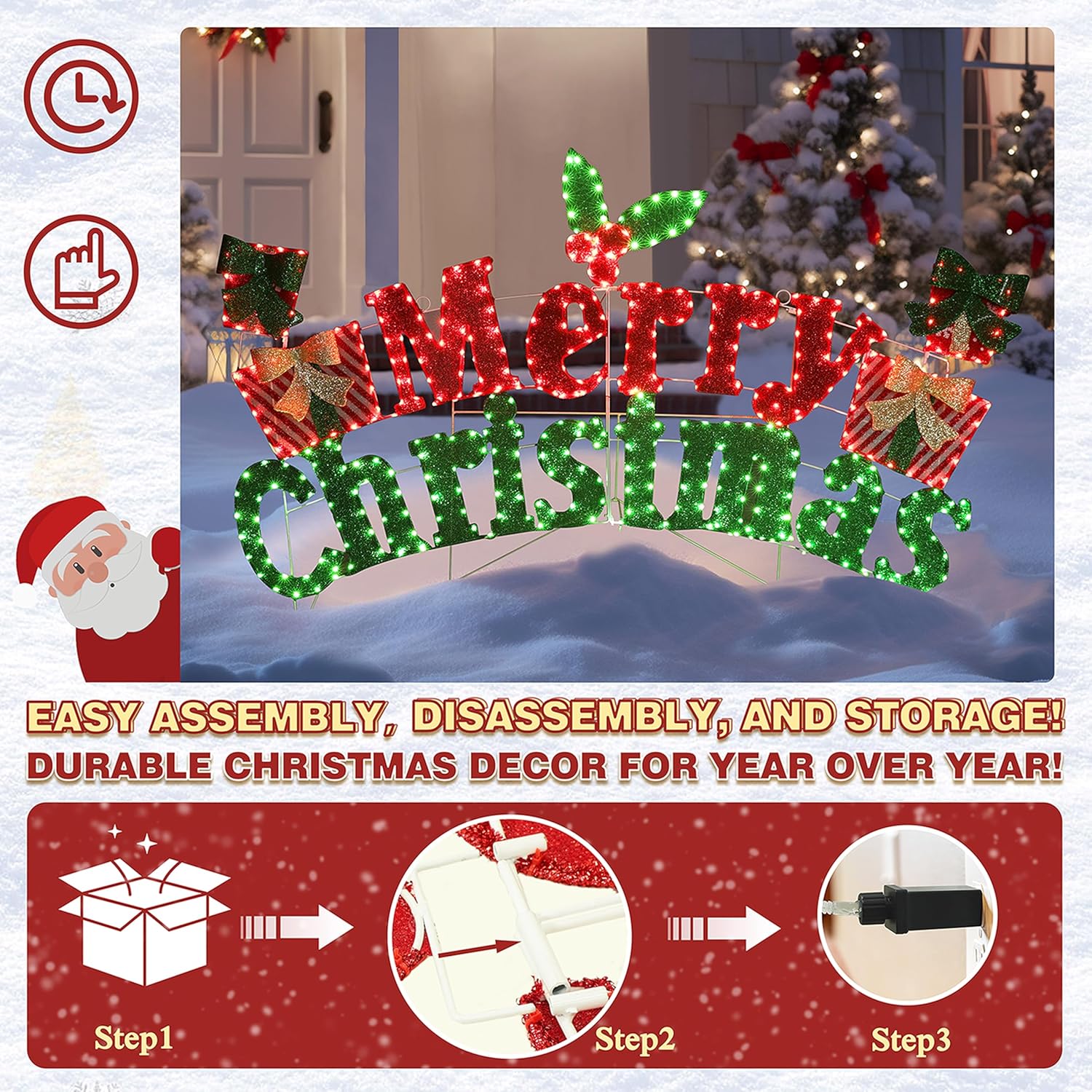- LED Lights: The pre lit Christmas sign is installed with dense 456 LED lights beads which make it sparkles red and green in the sun and night. Light up your front yard, make you become the focus of your neighbors