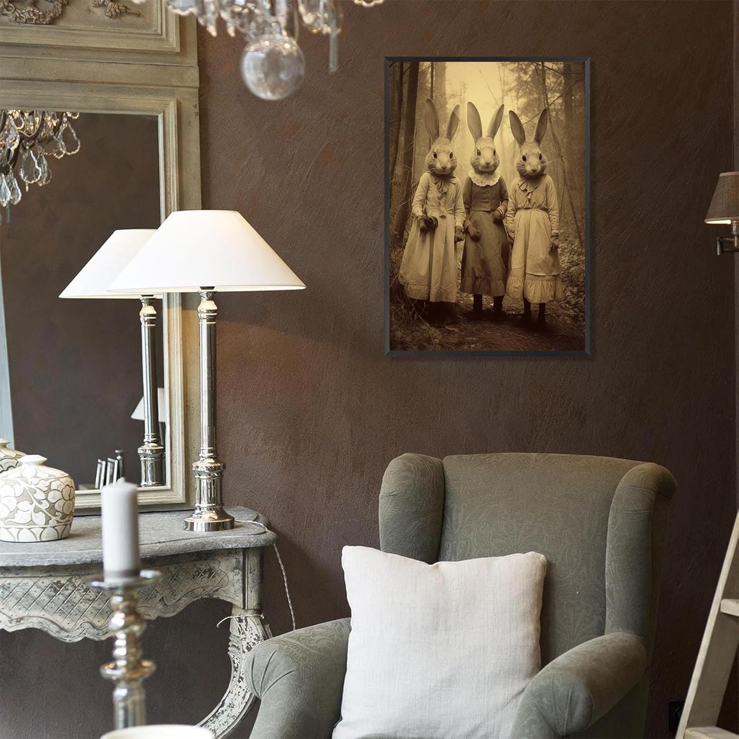 Vintage Horror Spooky Three Rabbits In Occult Forest Spooky Canvas Wall Art Poster Gothic Dark Academia Decorations Room Creepy Print Retro Halloween Wall Decor 24X36inch Aluminum Framed