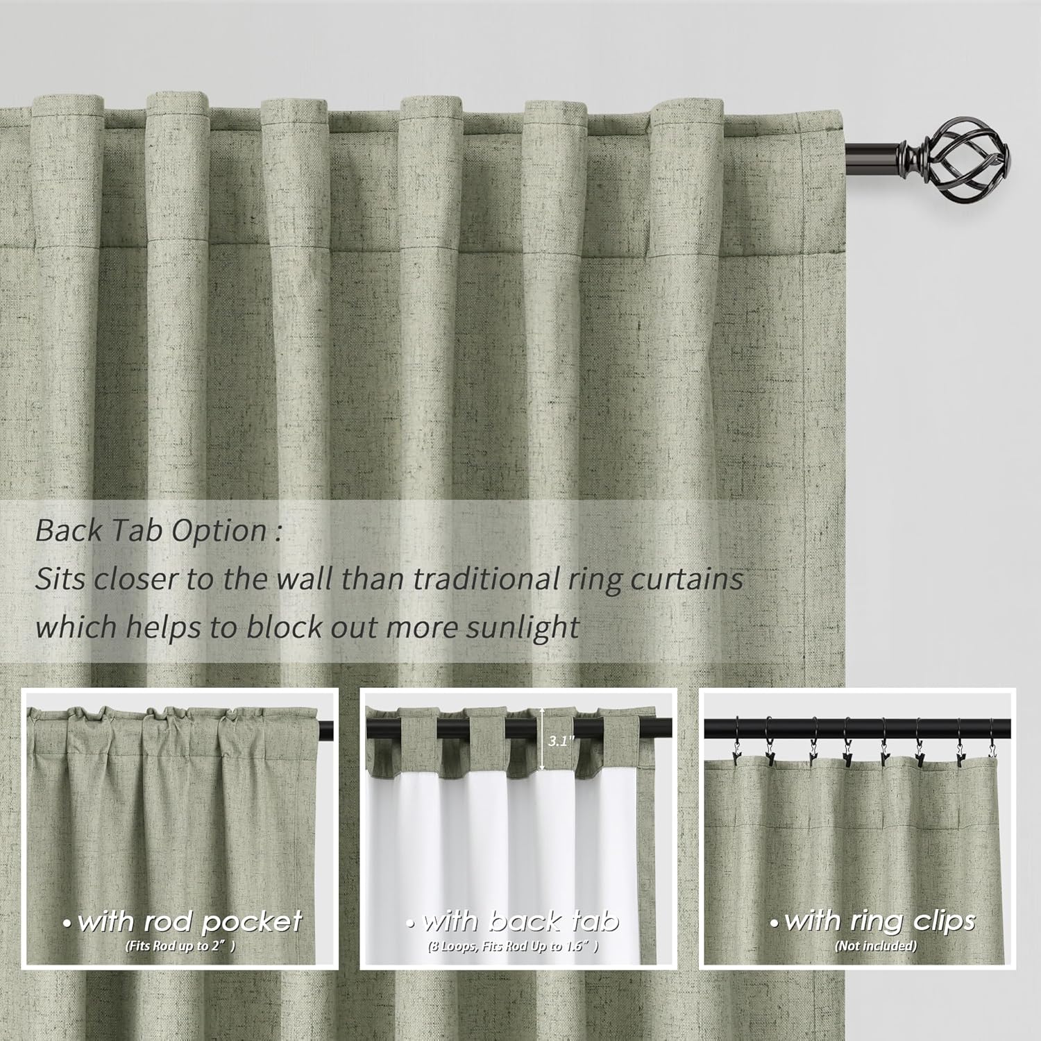 - 3 Hanging Options: Differ from the traditional curtains with grommet, BOODII linen curtains with back tab and rod pocket can full block sunlight fully. (1) Using the back tabs design to create an elegant pleated look and sit closer to the wall than traditional ring curtains, which helps to block out more sunlight; (2) Using rod pocket for a classic effect; (3) Using clip rings on track system or curtain rod, slide open/closed easily (clip rings are not included).