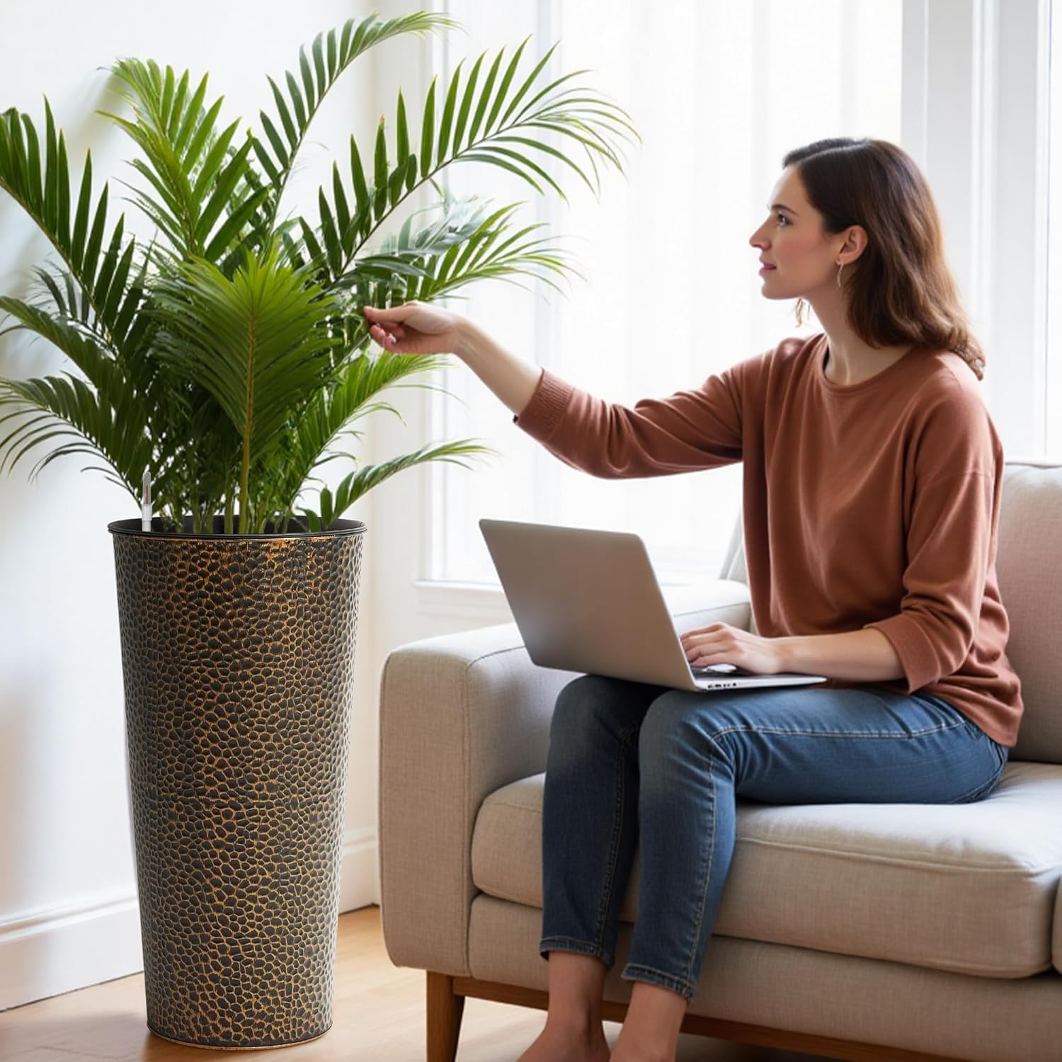 - Hand-Hammered Texture: These tall cone-shaped metal planters showcase a unique, hand-hammered texture, creating a striking focal point for any indoor or outdoor space. Each planter measures 28" in height, with a 13" top diameter and a 9.5" bottom diameter. Made of durable metal with a classic bronze finish, perfect for long-term use.
