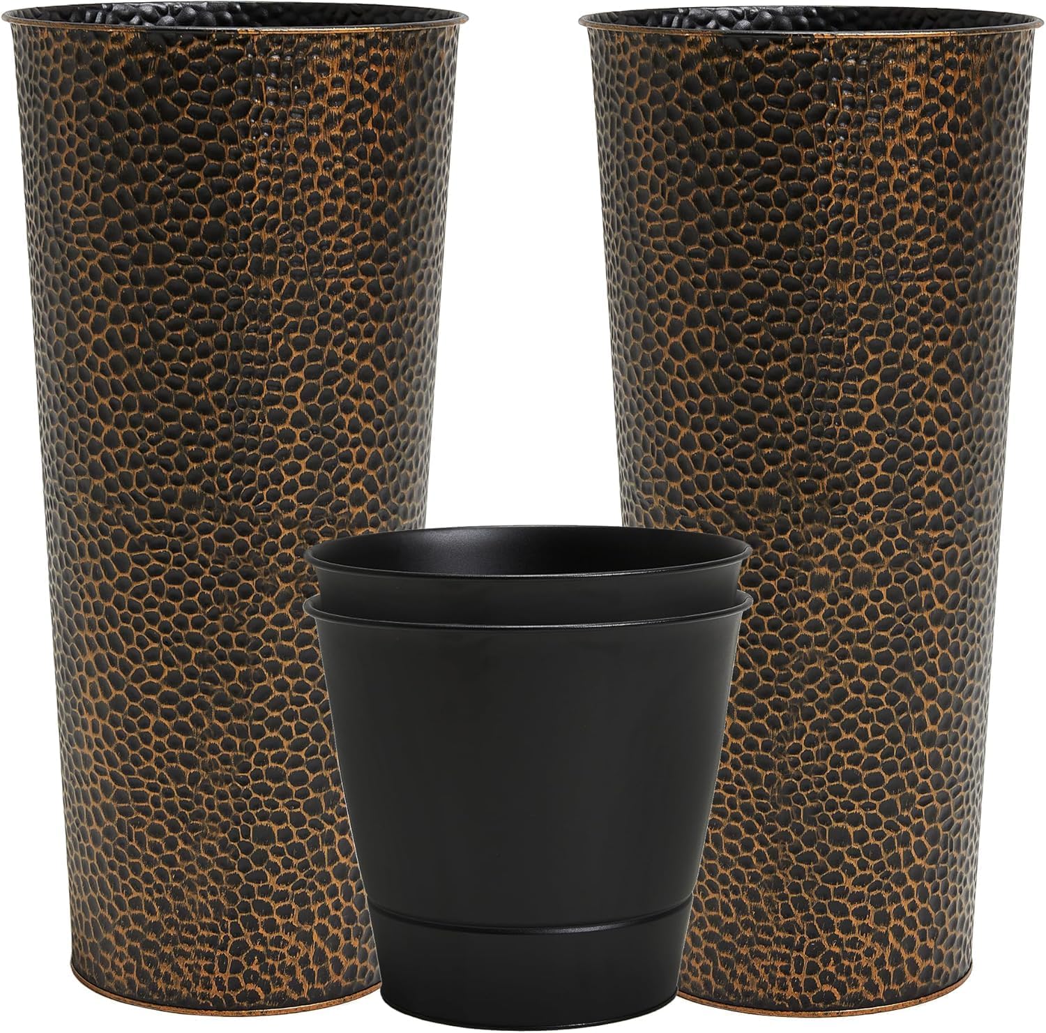 Worth Garden 2-Pack 28" H. Metal Planters with 2X Inside Pots - Hand-Hammered Texture Tall Narrow Cone Plant Pots - Large Handcrafted Bronze Flower Pot for Indoor Outdoor, Deck, Patio, Front Porch