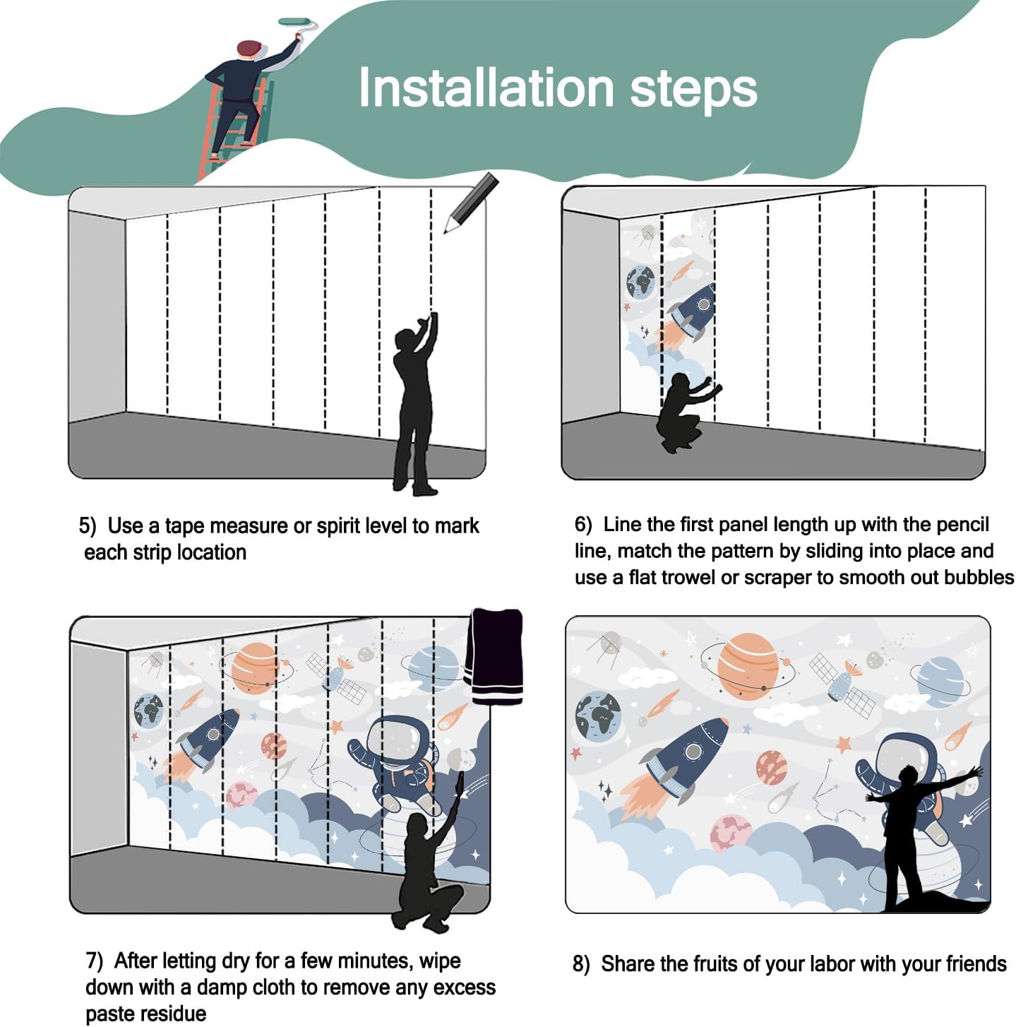 - Mural wallpaper size: 180 "W x 115 "H, divided into 9 sections, each section is labeled with a number underneath, there is no need to overlap the pattern when installing, just install according to the number labeled underneath the panel