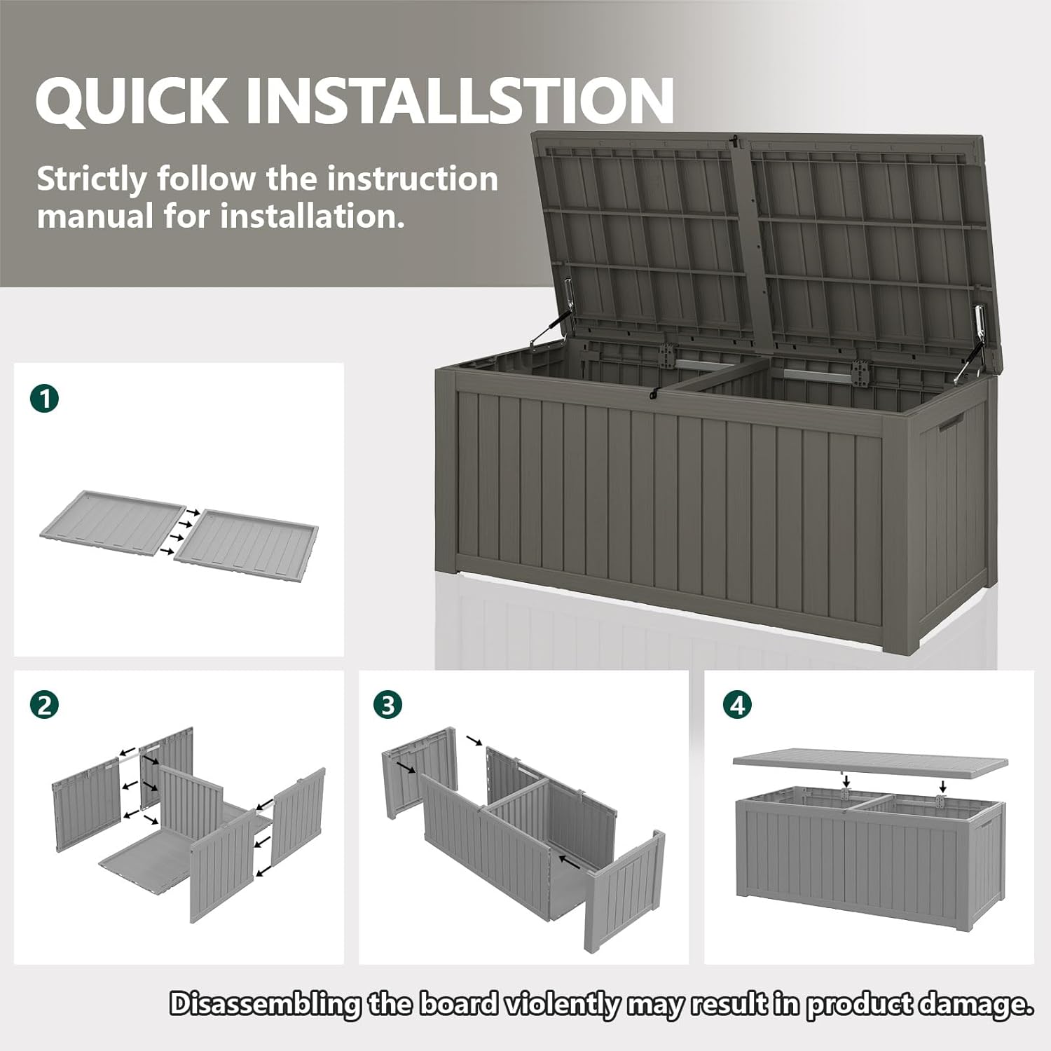 - EASY TO ASSEMBLE - Setting up this deck box is a breeze. Simply follow the provided instructions, connect the six side panels through the clasp, and you'll have a fully assembled box within just 30 minutes. Enjoy quick and hassle-free installation without the need for additional tools.