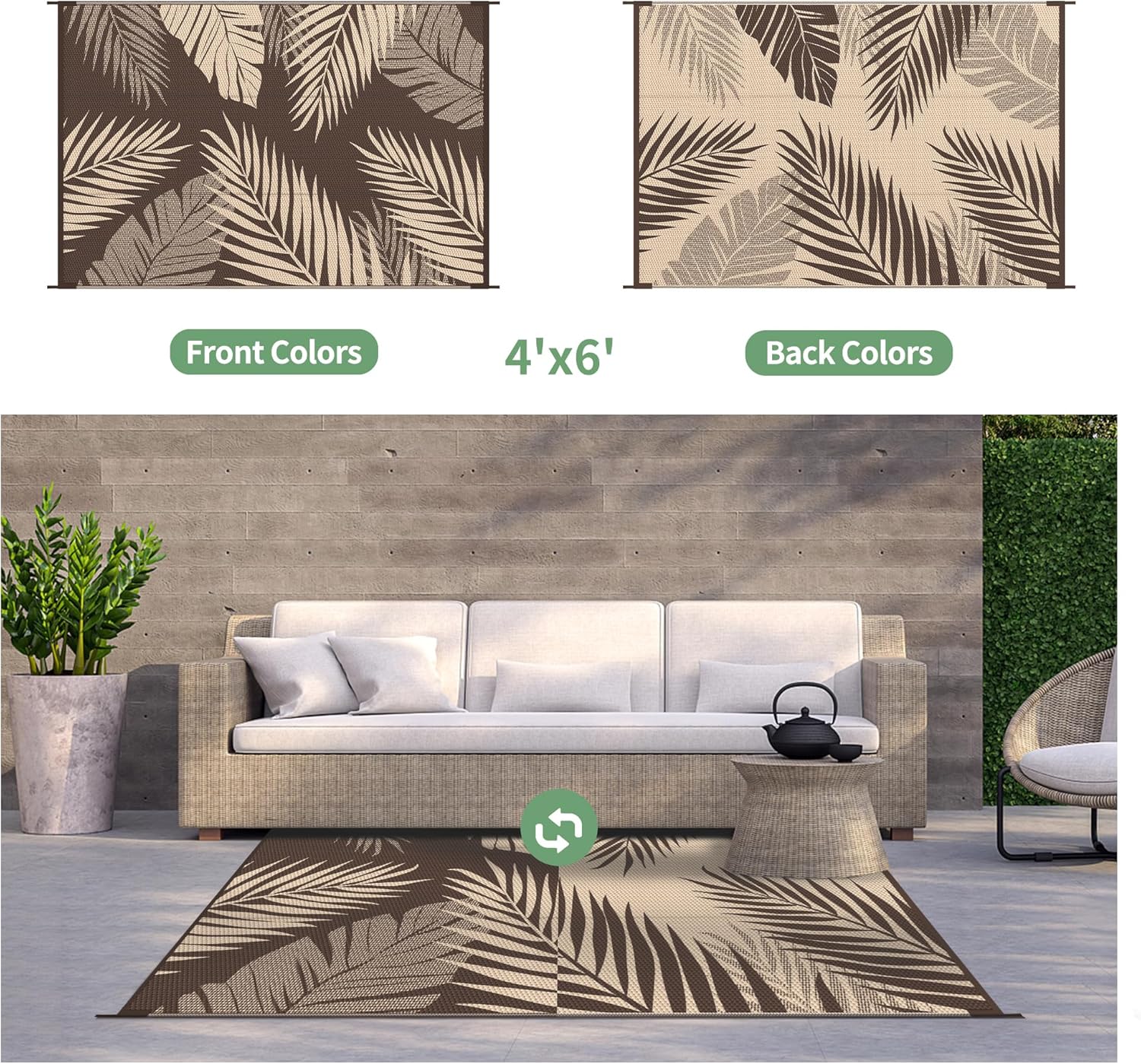 - Palm Leaf Design & Double-Sided Pattern: GENIMO reversible fall outdoor rug is designed with a double-sided pattern, completing the unique layout of multiple palm leaves. The 2 shades of coffee and beige achieve the ultimate fusion. Either side can blend perfectly with nature and look very full and comfortable, making it a versatile piece for fall decor