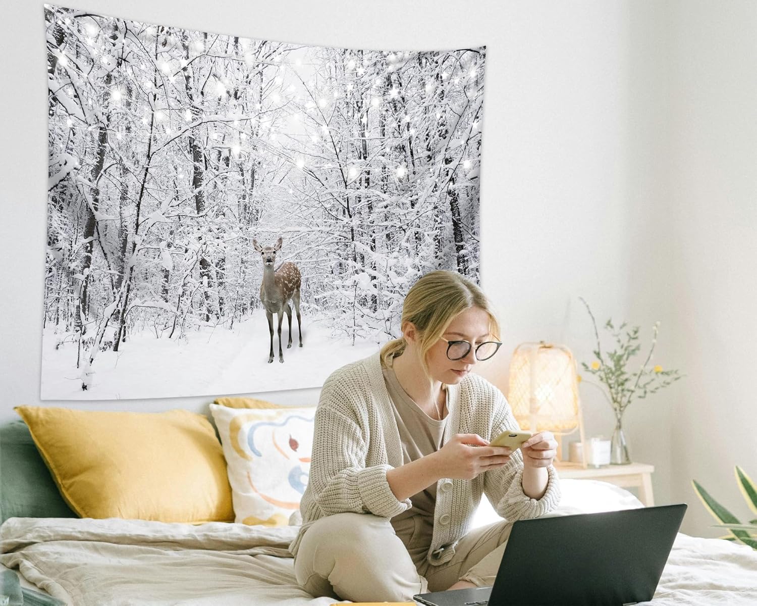 QGHOT Winter Tapestry Wall Hanging Snow Scene Backdrop Winter Wonderland Wall Decor Snowy Forest Wall Art Nature Woodland Deer Tapestry for Bedroom Room Dorm Party Decoration