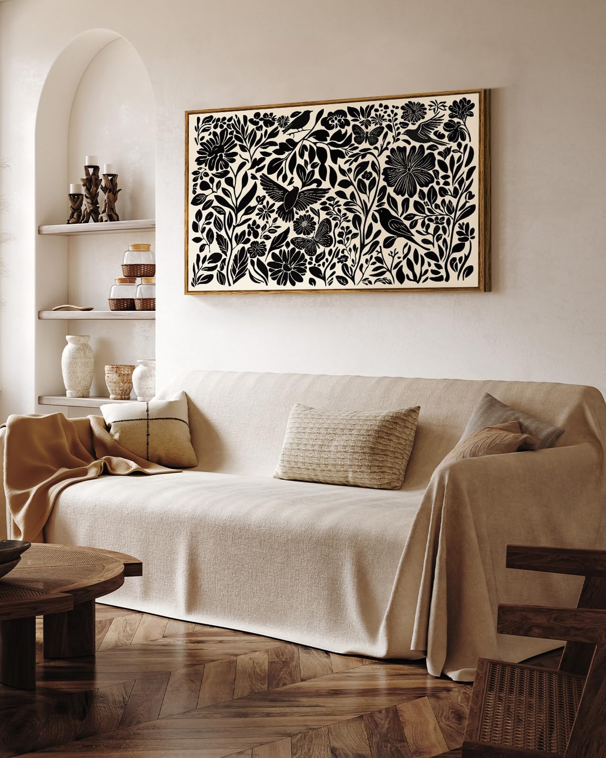 VIYYIEA Framed Canvas Wall Art, Black and White Large Wall Art for Living Room, Print Paintings, Boho Home Office Decor, Bedroom Wall Decor -【Flowers & Birds】-(24"x36")