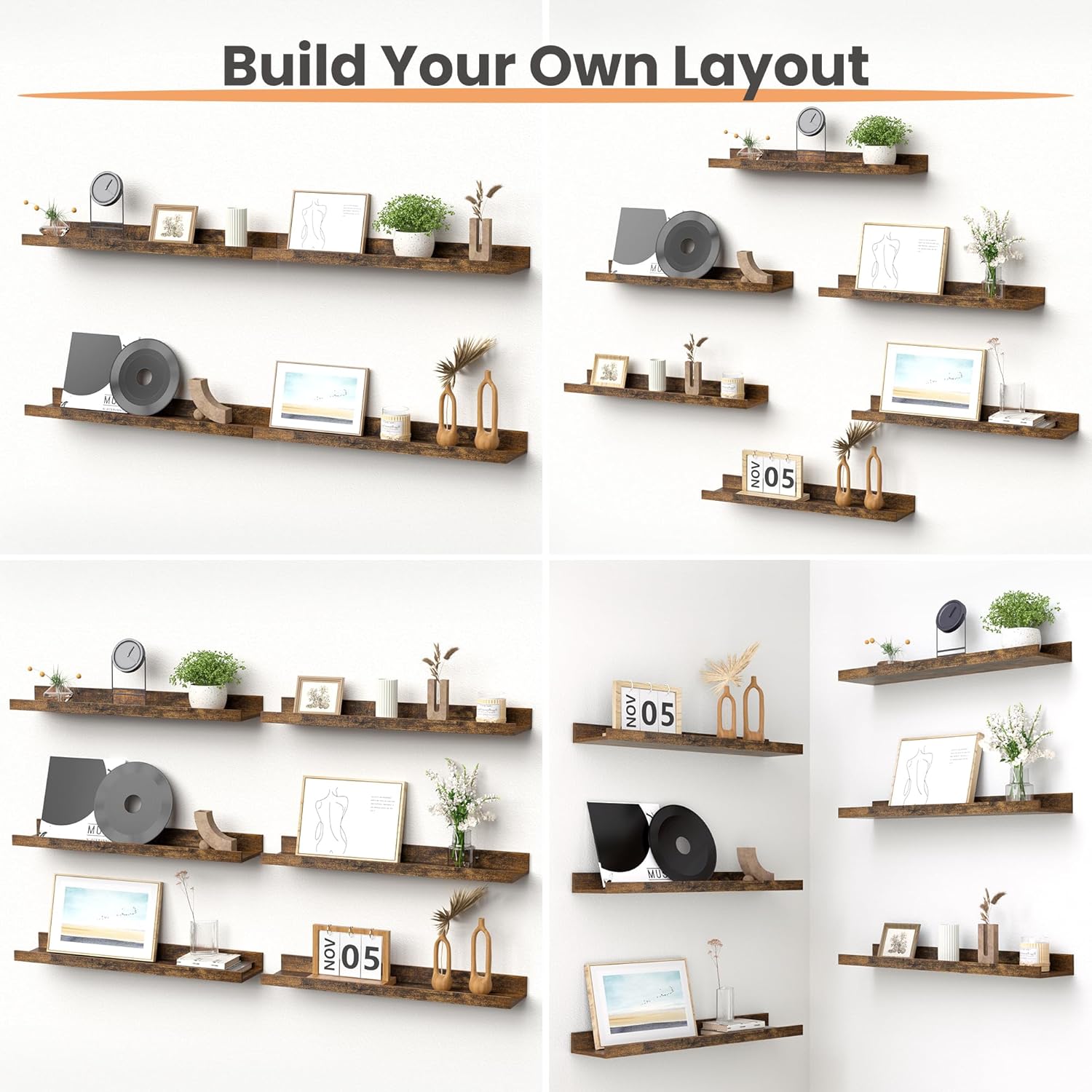 upsimples Floating Shelves for Wall, Wall Shelves for Decor Storage Set of 6, Wall Mounted Wood Shelf for Bedroom, Living Room, Bathroom, Kitchen, 23.6 inch Long Picture Ledge Shelf, Brown