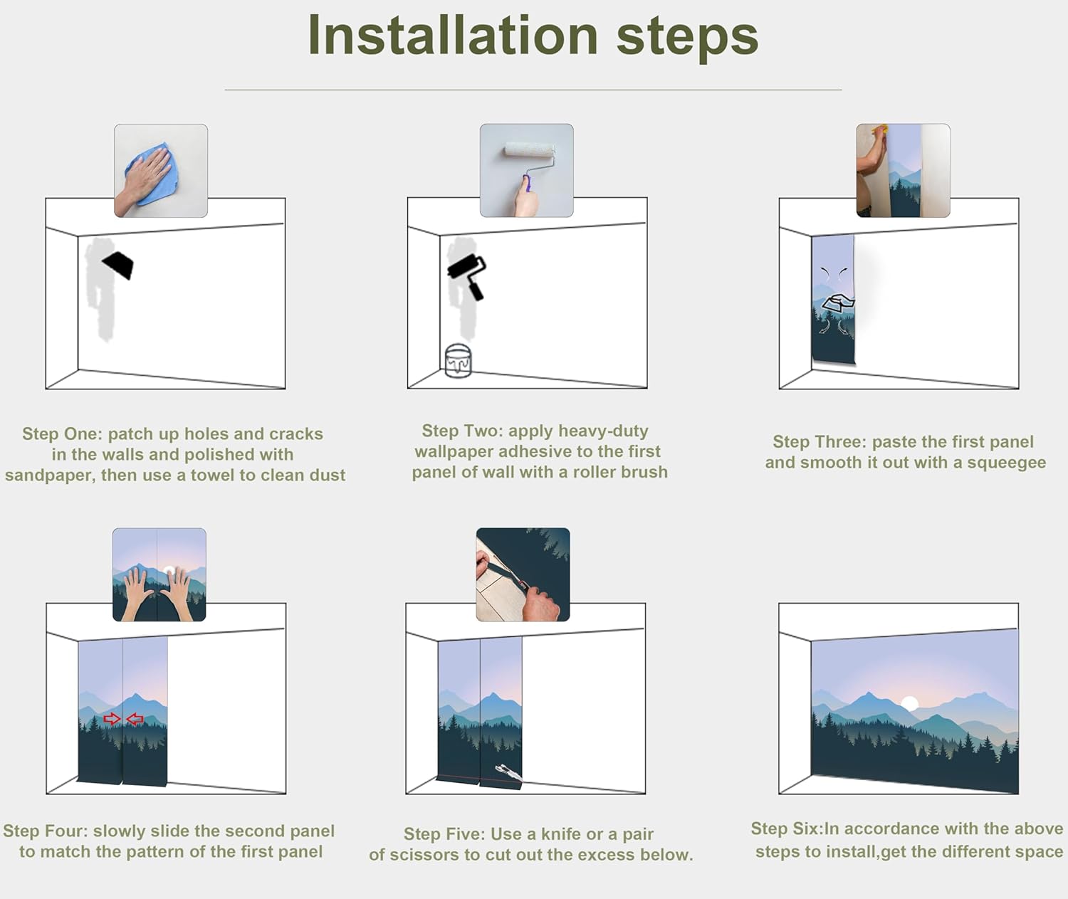 - INSTALLATION - 1.Fill in all cracks or holes and clean dust dirt and grease on the wall surface. 2. Apply the heavy duty wallpaper paste on the wall not mural. 3. Use a spirit level to mark first strip location. 4. match the pattern by sliding into place. 5.use a scraper to smooth out bubbles press. 6. Let dry for a few minutes and that's it! Please Note: Not self-adhesive. We recommend to use a standardized fleece wallpaper paste.