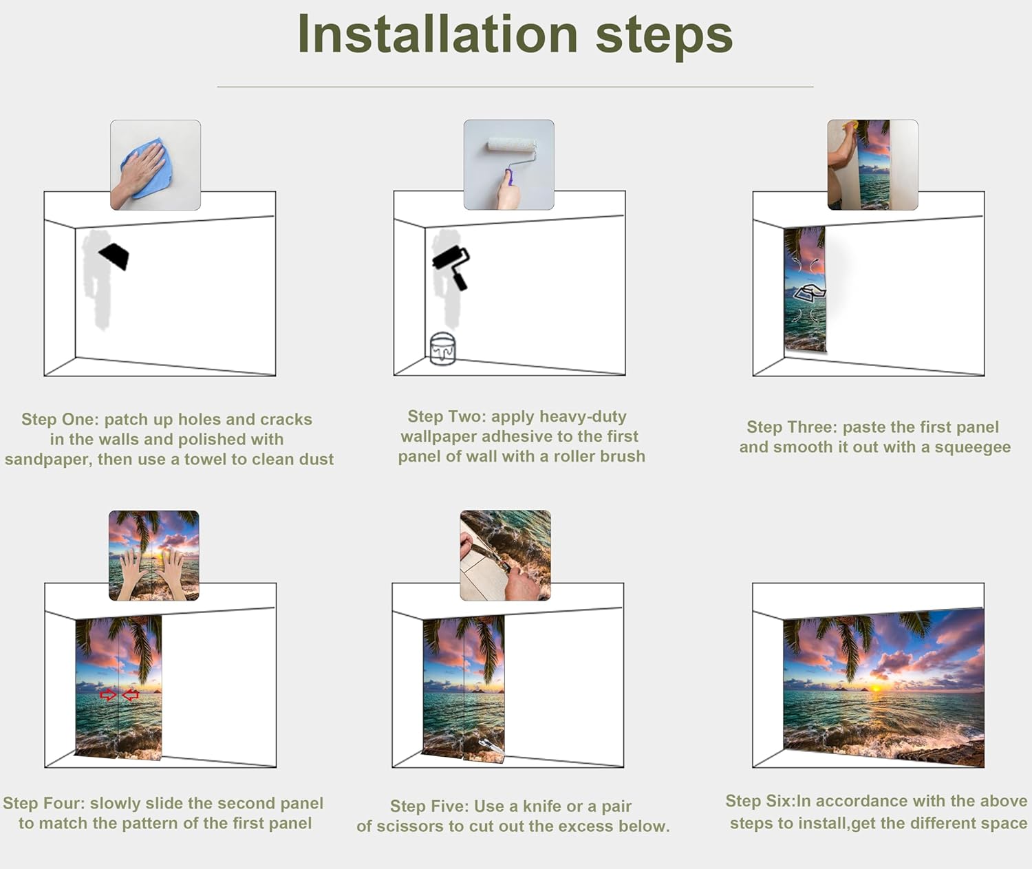 - INSTALLATION - 1.Fill in all cracks or holes and clean dust dirt and grease on the wall surface. 2. Apply the heavy duty wallpaper paste on the wall not mural. 3. Use a spirit level to mark first strip location. 4. match the pattern by sliding into place. 5.use a scraper to smooth out bubbles press. 6. Let dry for a few minutes and that's it! Please Note: Not self-adhesive. We recommend to use a standardized fleece wallpaper paste.