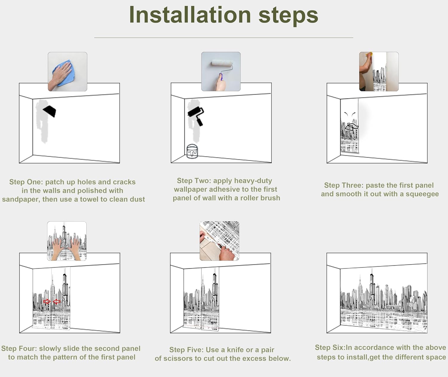 - INSTALLATION - 1.Fill in all cracks or holes and clean dust dirt and grease on the wall surface. 2. Apply the heavy duty wallpaper paste on the wall not mural. 3. Use a spirit level to mark first strip location. 4. match the pattern by sliding into place. 5.use a scraper to smooth out bubbles press. 6. Let dry for a few minutes and that's it! Please Note: Not self-adhesive. We recommend to use a standardized fleece wallpaper paste.
