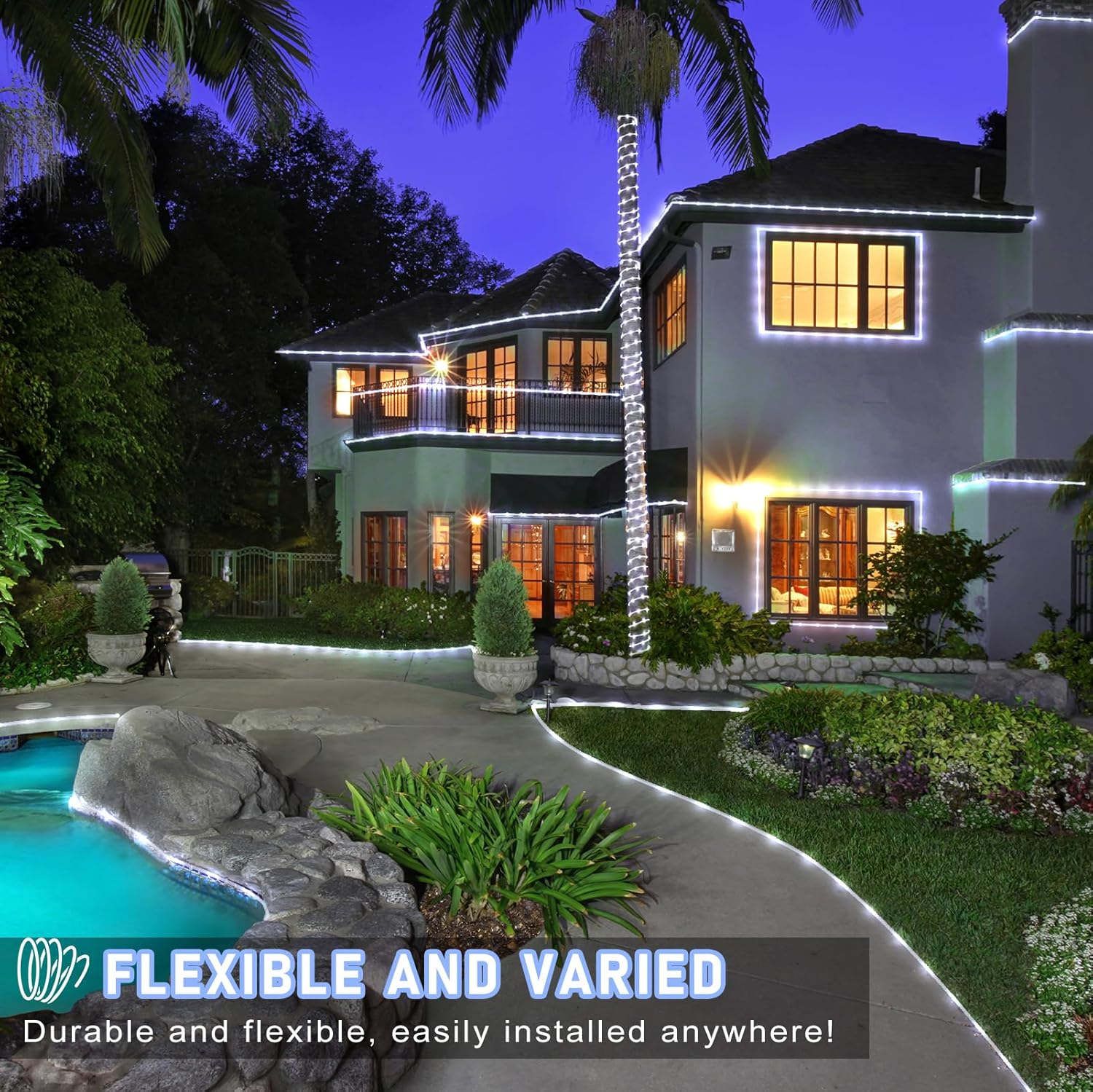 - 【Safe and Reliable】- The Christmas lights outdoor is covered with a transparent and thick PVC tubes that allows full 360° all-round lighting, delivering a full and even lighting experience. Plus, the 164ft rope lights feature a UL-certified 30V low-voltage power adapter. It won't overheat for a long time of use and is safe for kids and pets.