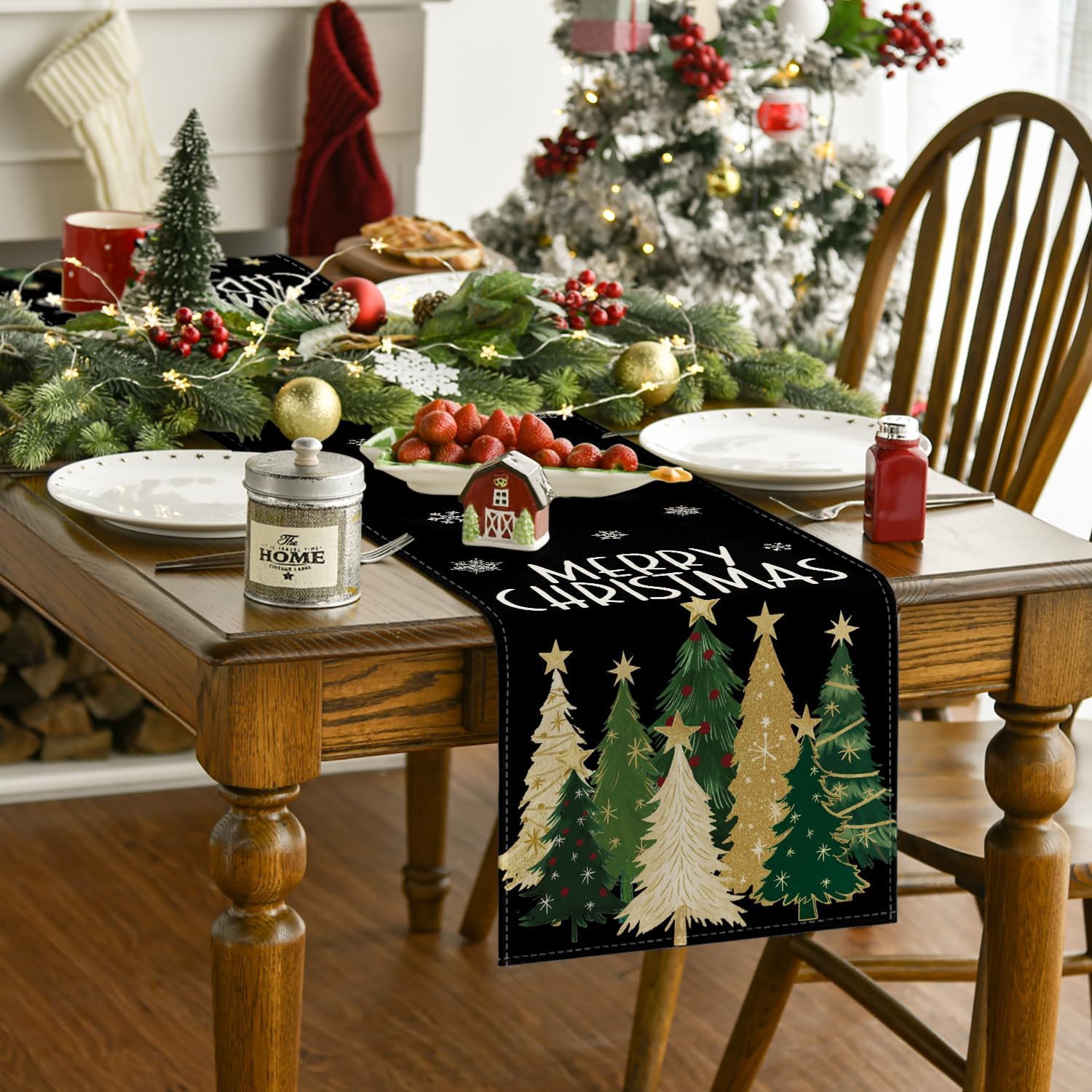 Artoid Mode Xmas Trees Snowflakes Black Merry Christmas Table Runner, Winter Seasonal Kitchen Dining Table Decoration for Home Party Decor 13x36 Inch