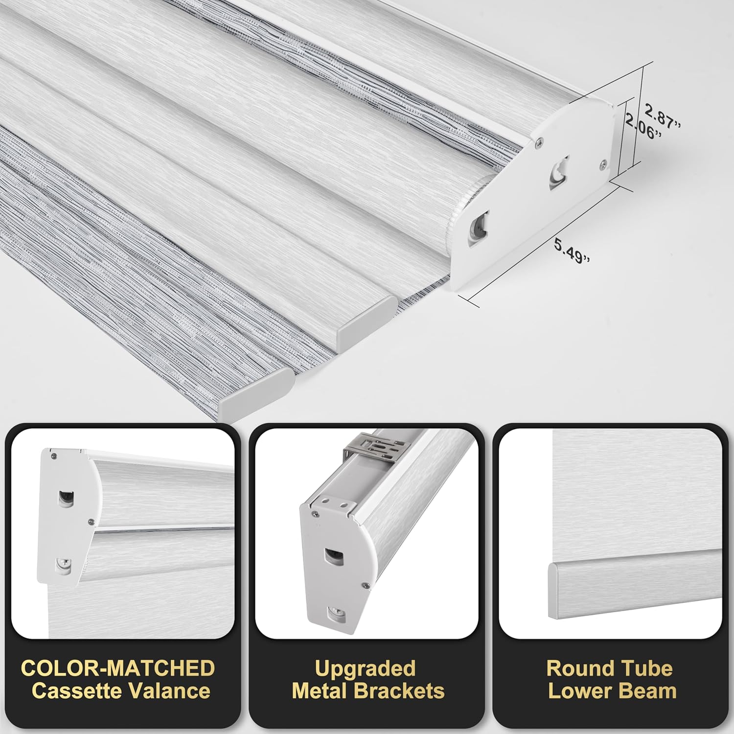 - FREE STOP CORDLESS SYSTEM:The cordless double roller shade prioritizes safety with a cordless design designed for families with small children or pets.You just need to pull down or push up to stop at any position you want. COLOR-MATCHED CASSETTE VALANCE:The hidden installation of the cordless roller blinds can effectively reduce installation gaps, reduce light leakage.The color of the cassette valance is same as the fabric color,making the day night blinds more beautiful after installation.