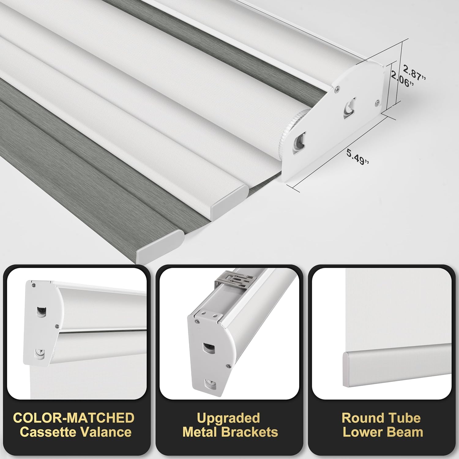 - FREE STOP CORDLESS SYSTEM:The cordless double roller shade prioritizes safety with a cordless design designed for families with small children or pets.You just need to pull down or push up to stop at any position you want. COLOR-MATCHED CASSETTE VALANCE:The hidden installation of the cordless roller blinds can effectively reduce installation gaps, reduce light leakage.The color of the cassette valance is same as the fabric color,making the day night blinds more beautiful after installation.