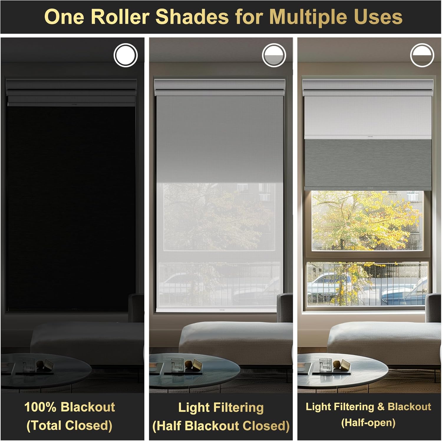 - MULTI-PURPOSE SHADE:Dual roller shades consisting of blackout and light filtering shades, blackout roller shade can 100% blackout,thermal insulation and UV Protection,so that you can experience quiet and comfort of the night during daytime;Light filtering roller shade allow light to filter into your room,and no glare,soft diffused light allow for perfect balance of light and darkness,and also enhances overall aesthetics of your home,allowing for a romantic and comfortable living environment.