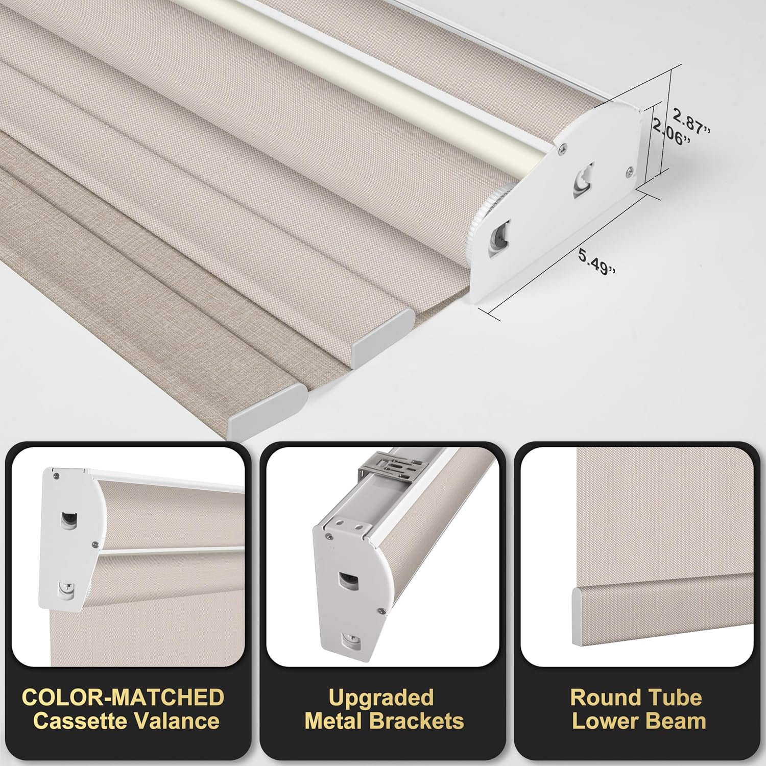- FREE STOP CORDLESS SYSTEM:The cordless double roller shade prioritizes safety with a cordless design designed for families with small children or pets.You just need to pull down or push up to stop at any position you want. COLOR-MATCHED CASSETTE VALANCE:The hidden installation of the cordless roller blinds can effectively reduce installation gaps, reduce light leakage.The color of the cassette valance is same as the fabric color,making the day night blinds more beautiful after installation.