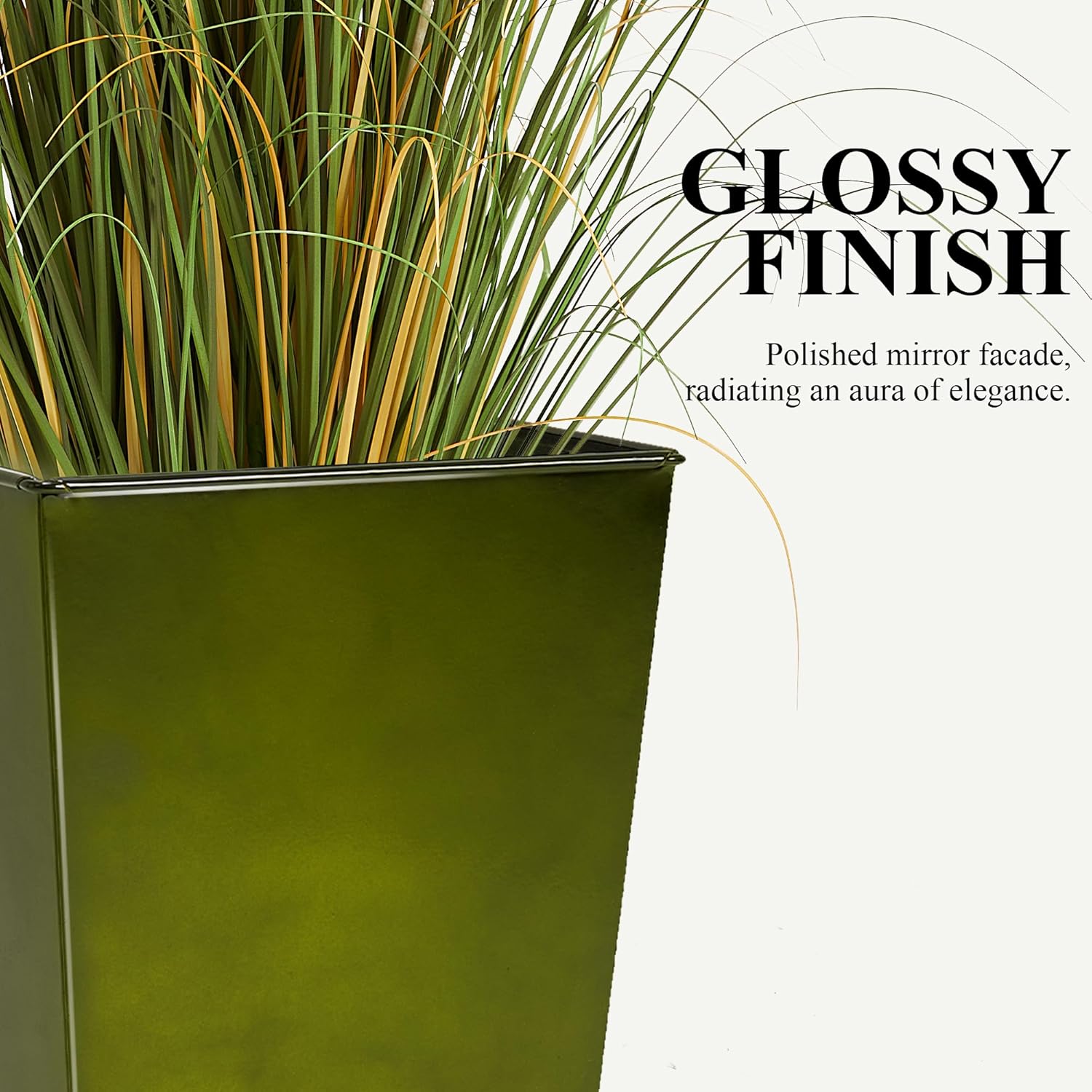 WORTH Garden 28" Large Metal Glazed Planter Set of 2, Luxurious Glossy Finish Green Tall Square Tapered Steel Plant Pots, Decor Flower Pot Indoor & Outdoor, Drainage Hole & Dual-Purpose Plant Saucer