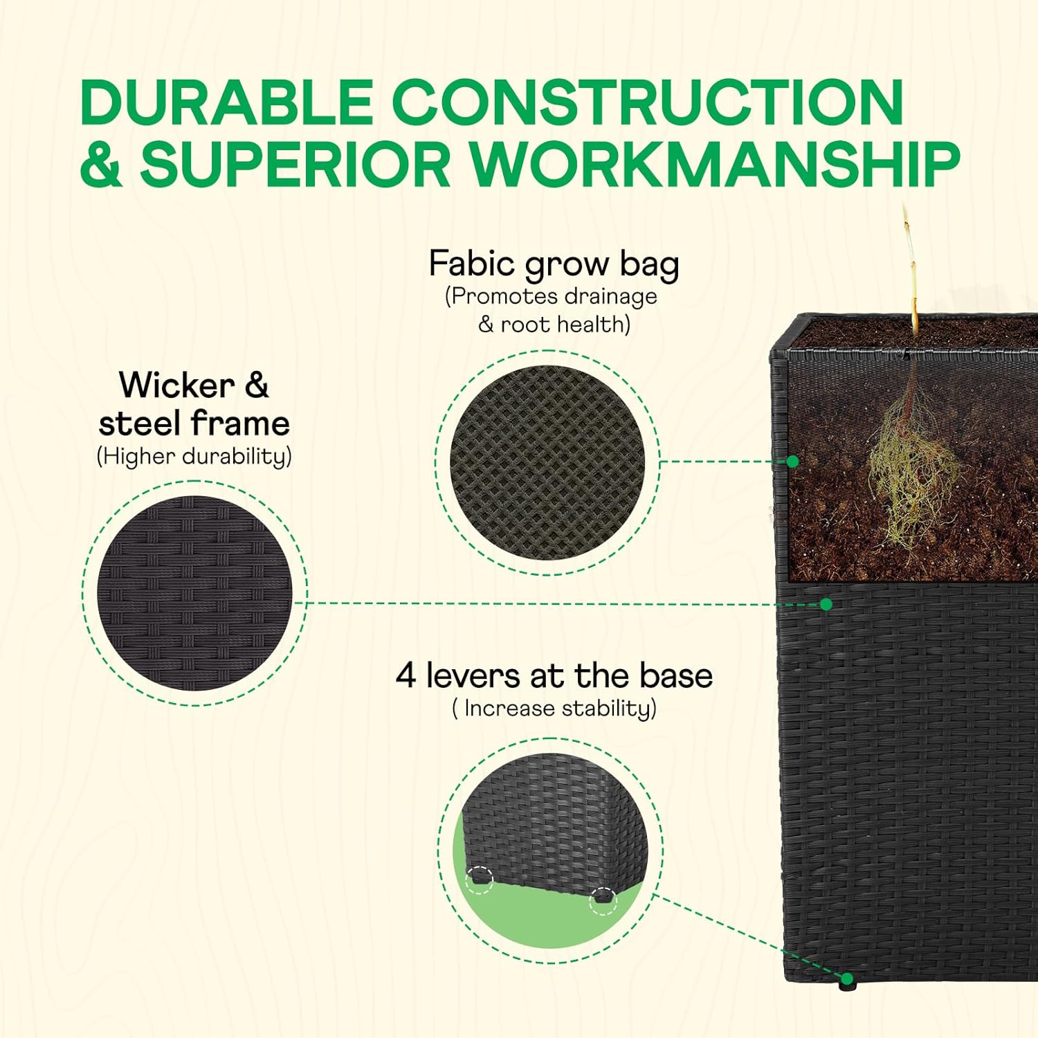 - Self-watering irrigation system: features a water tank and tray for controlled hydration; drainage hole to prevent overwatering; minimal maintenance required; pairs perfectly with a wicker planter basket for a chic display