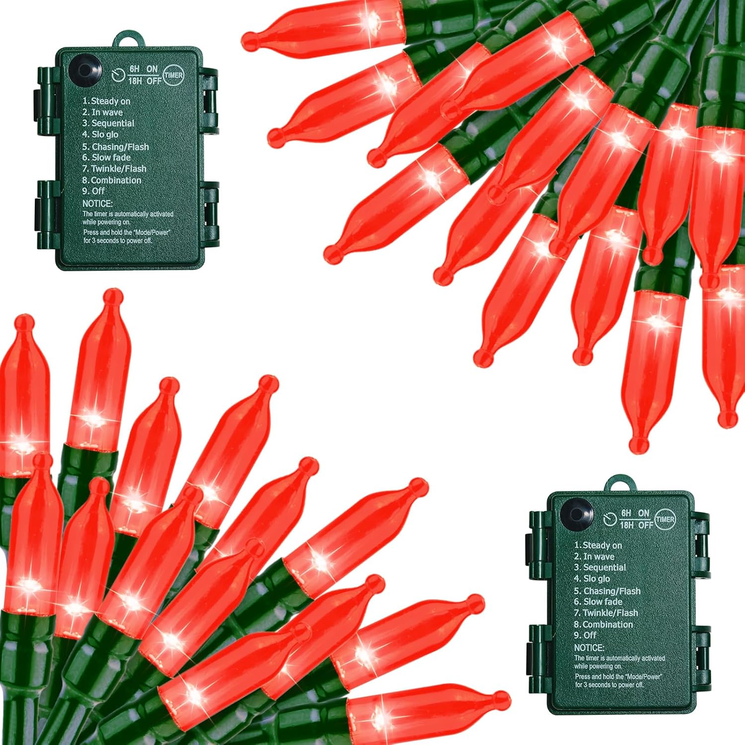 - 【Manual operation】There is 8 various fantastic lighting effects adapting to desired occasions or events: press the button on control box repeatedly to select 1.combination, 2.in wave, 3.sequential, 4.slow glow, 5.chasing or flash, 6.slow fade, 7.twinkle or flash or 8.steady on