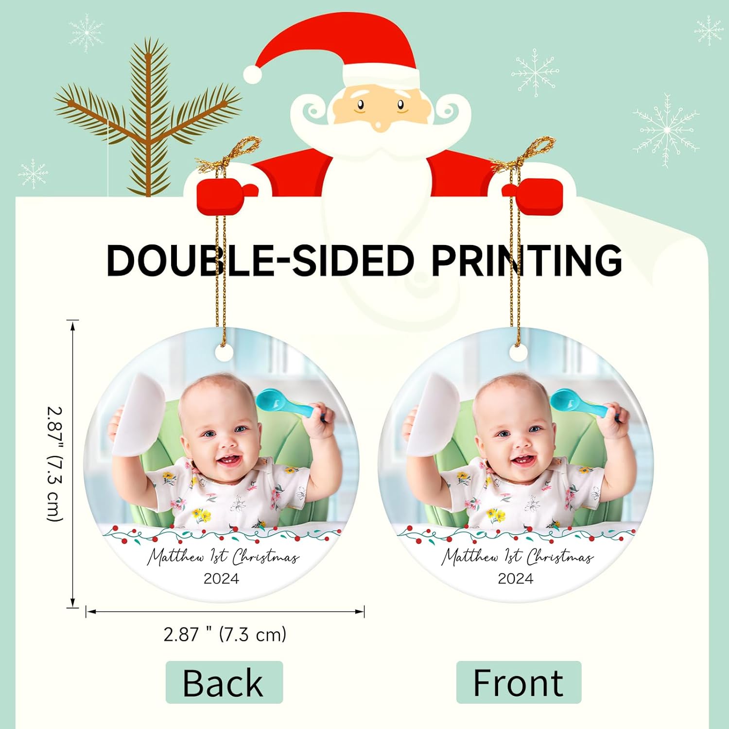 • PREMIUM QUALITY CERAMIC:Crafted from high-quality ceramic, this baby's first Christmas ornament is built to last as a cherished keepsake. Featuring double-sided printing with durable, waterproof, and wear-resistant inks, it adds an elegant touch to your holiday decor, preserving lasting memories of your special moments.
