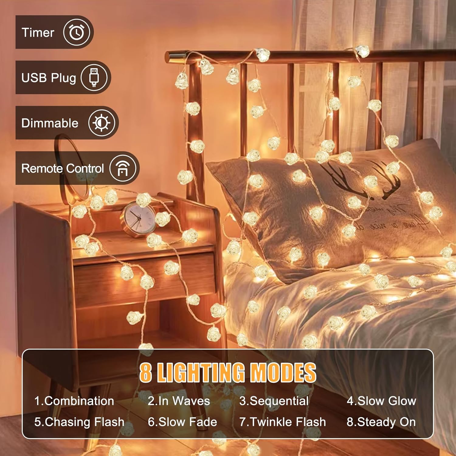 String Lights Indoor, 33Ft 80 LED Rose Flower Lights, 8 Modes Dimmable & Timeable Twinkle Lights, Festival Christmas Decorations for Bedroom Living Room, White, USB Plug, Remote