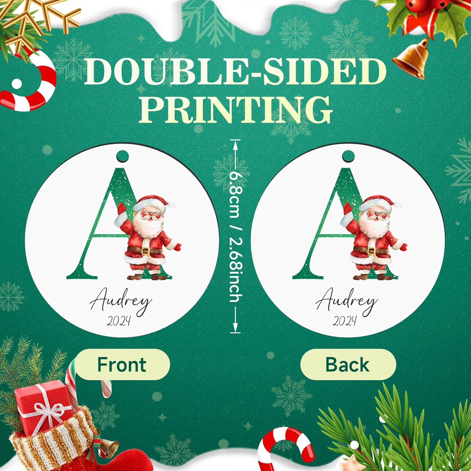 • 【Double-Sided HD Printing Christmas ornament Personalized】Custom Christmas ornament for Christmas tree use HD printing technology, double-sided printing the same, bright colors,not easy to fade.About 2.68", you can type the family member name,we will print the name on the custom ornament, give personalized family ornament to him or her as Christmas gift ideas