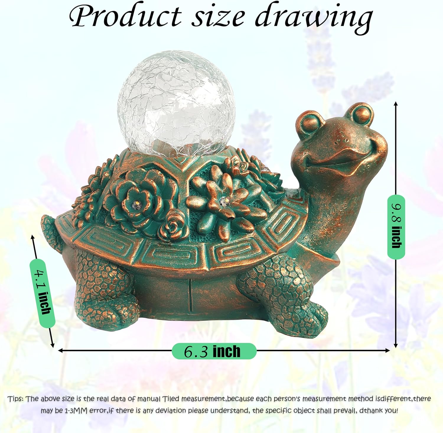 - 【Unique design】This charismatic turtle gracefully holding a solar lantern, adds a touch of magic to your outdoor space, casting a warm and welcoming glow.The size of this turtle figurine is 9.8X6.3X4.1inches,the lantern is 5.5X2.75X2.75inches.The turtle figurines made of resin material, hand-painted and finished with a UV resistant coating can withstand rain, snow or scorching sun without fading.